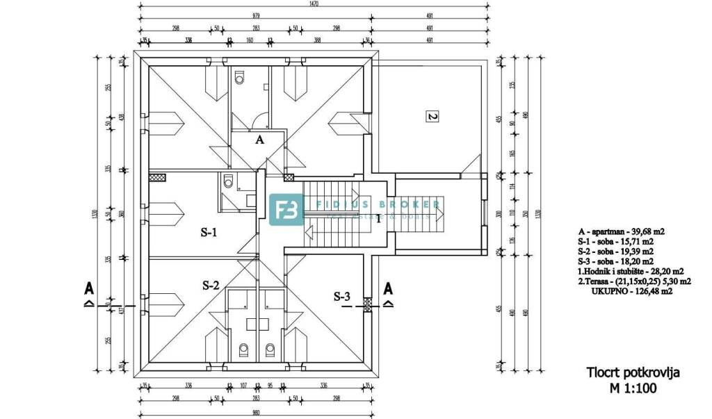 U potkrovlju se također nalazi suite apartman i tri prekrasne sobe, S1, S2 i S3. Ukupna netto površina potkrovlja iznosi 126,48 m2.