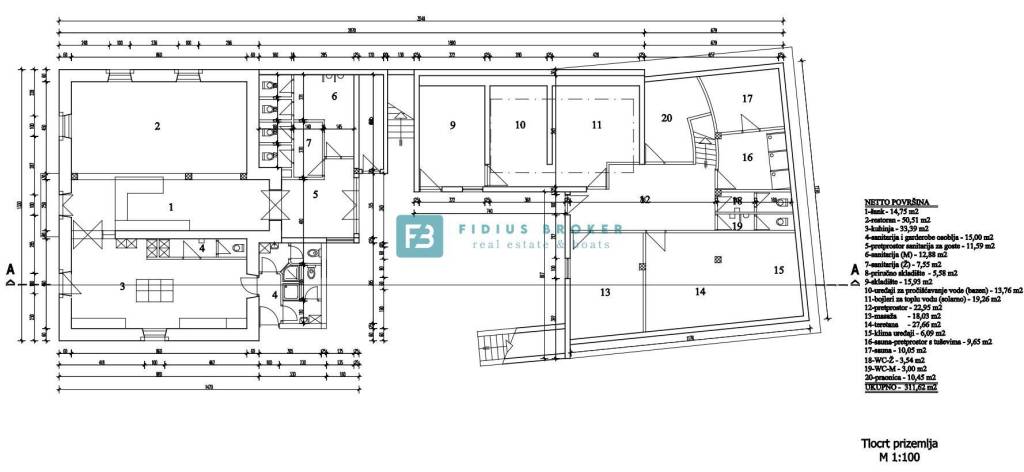 Prizemlje odiše raskošću i elegancijom gdje se nalazi vanjska terasa s pogledom na more, caffe bar/šank, restoran i dobro opremljena kuhinja, sanitarije i garderobe osoblja, predprostor sanitarija za goste, 2 x sanitarije, dva skladišta, bazenska aparatura, bojleri za toplu vodu (solarno), klime, predprostor, prostor za masažu, teretana, sauna s tuševima, sauna, dodatni WC-ženski, WC-muški te praonica. Sveukupna netto površina prizemlja iznosi 311,62 m2.