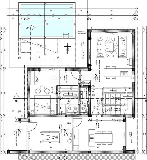 Ground floor – airy and harmonious open‑plan living space with living room, dining area, and modern kitchen. Large glass walls bring in abundant natural light, and the kitchen features high‑quality appliances from reputable brands.