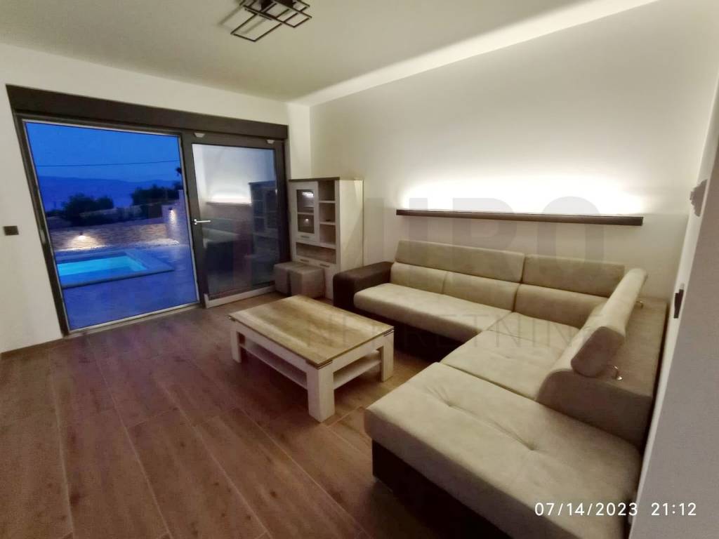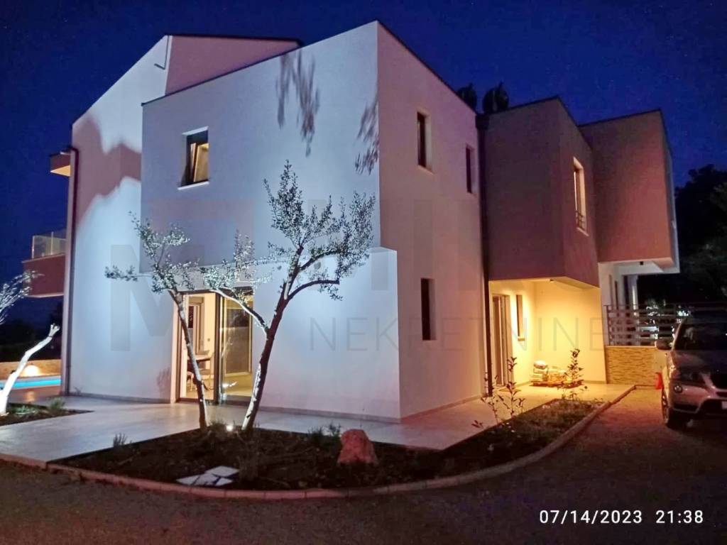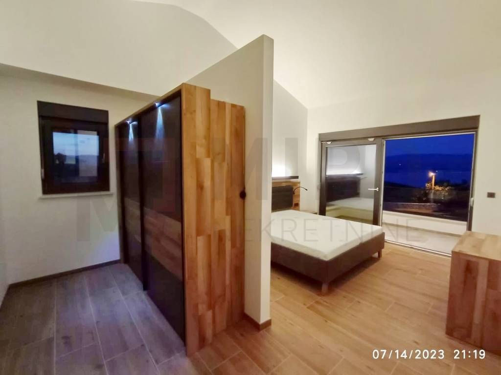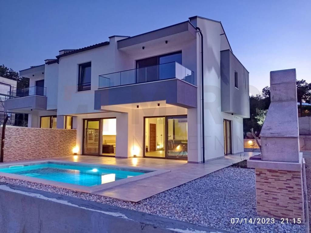 The island of Krk, near Vrbnik, a new semi-detached house with a swimming pool and a beautiful view of the sea is for sale. The house consists of two floors. The building is 150m2 of living space. The ground floor consists of: a covered entrance, hallway, toilet, laundry room, kitchen and living room, and a covered terrace. An internal staircase leads to the first floor where there is a hallway, 1 master bedroom and 2 bedrooms, 2 bathrooms, a wardrobe and an uncovered balcony and a covered balcony. The house has a swimming pool with a sunbathing area, a summer kitchen with a barbecue, a garden decorated and decorated with Mediterranean plants and a beautiful panoramic view of the sea. 2 cars can be comfortably parked in the property's spacious garden. This property is owned by a natural person. The seller of the house guarantees complete documentation. Visit us and find the square footage of your home!