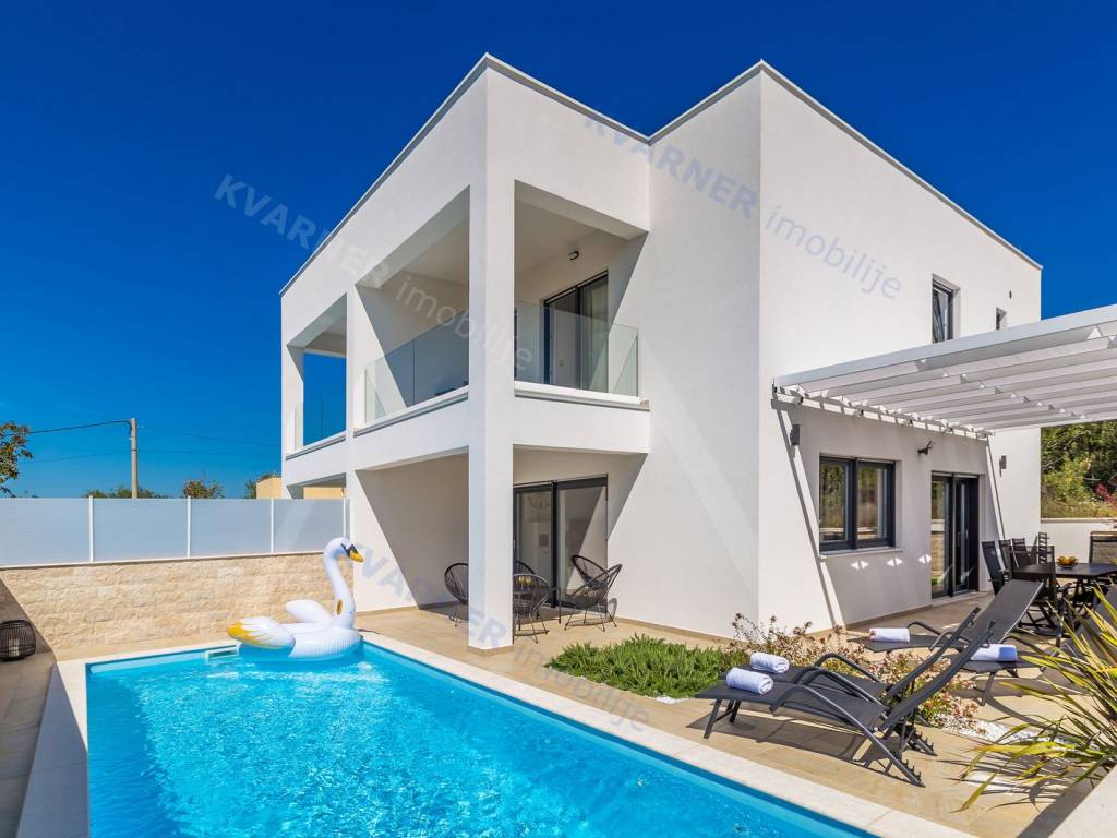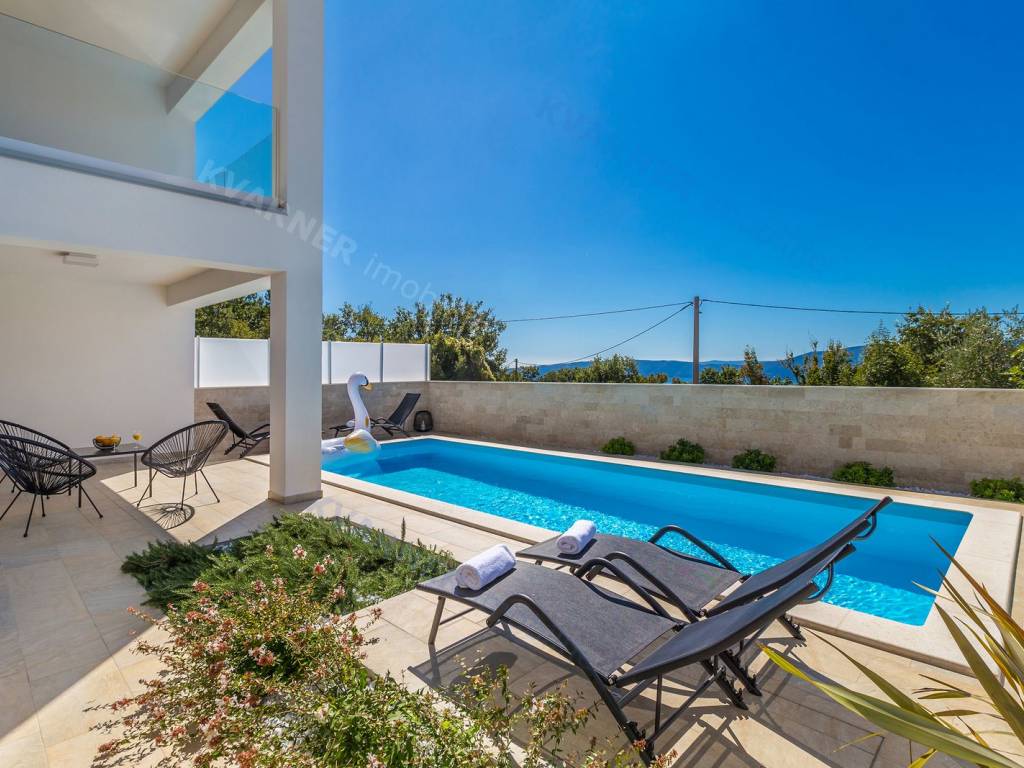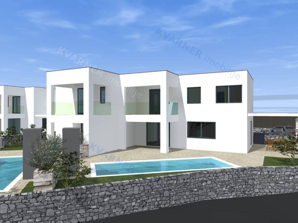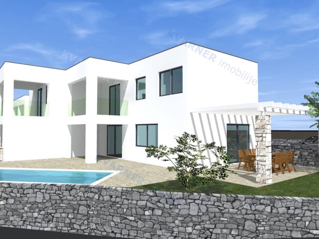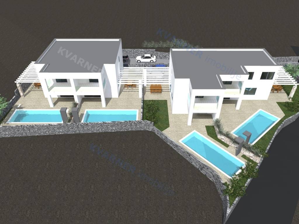 The island of Krk - only in our offer! For sale are two new, modern and luxuriously equipped houses in a quiet position away from the crowds and city bustle, ideal for a pleasant vacation or renting. The house is built on two floors - a total area of 118 m2, and consists of three bedrooms, three bathrooms, kitchen with living room, large terrace and garden with pool and sun deck. The terrace offers a beautiful view of the sea and the surrounding islands. Along with the existing facilities, the price includes a plot of 600 m2 with a building permit and paid utilities for the construction of another of the same facility - a double with swimming pools.