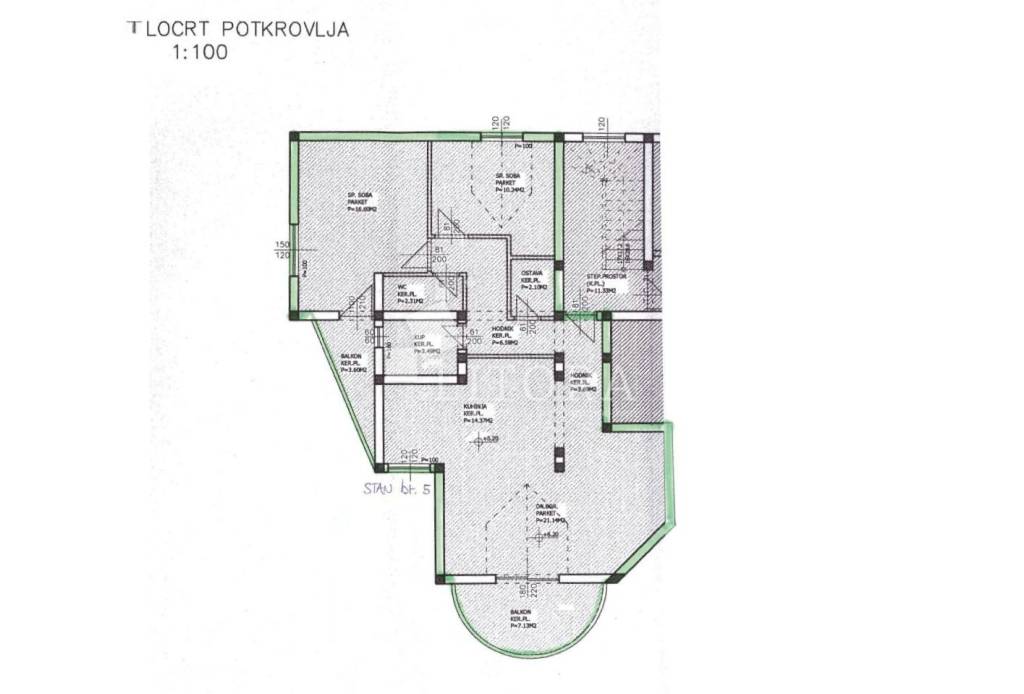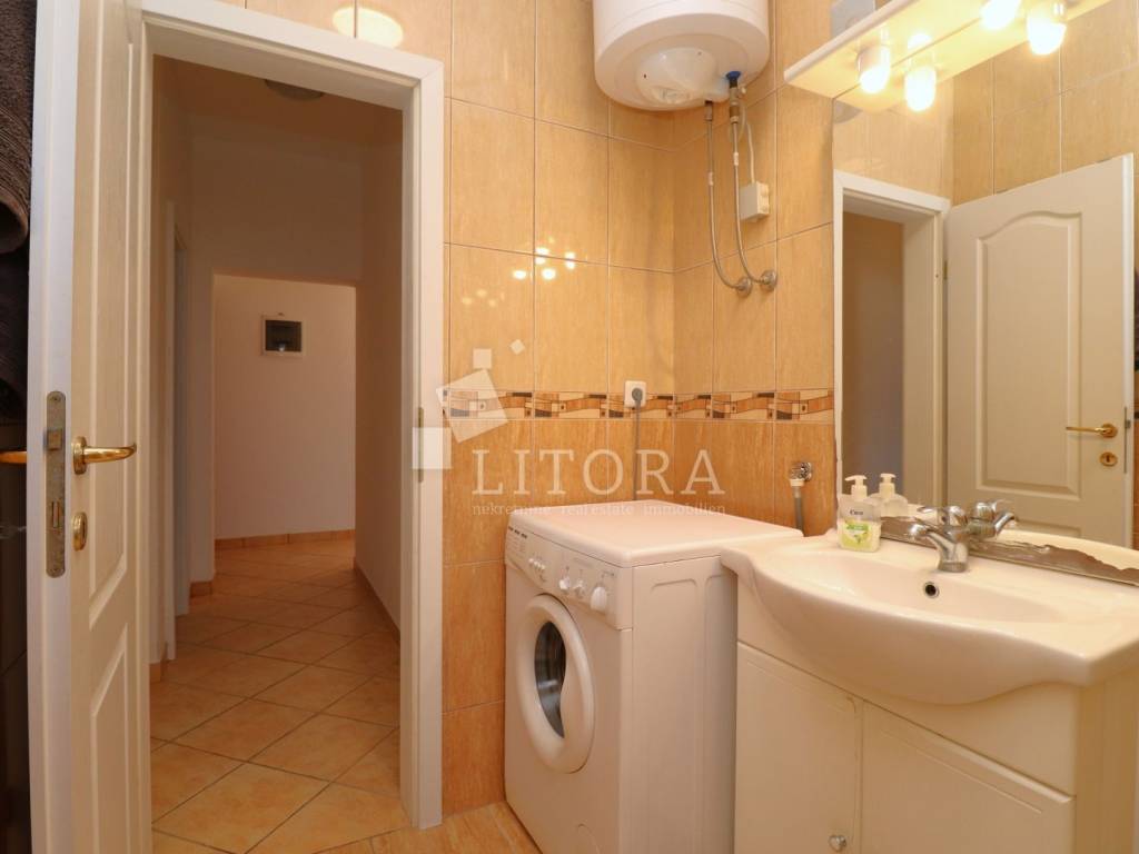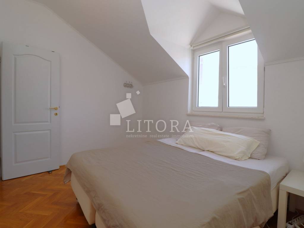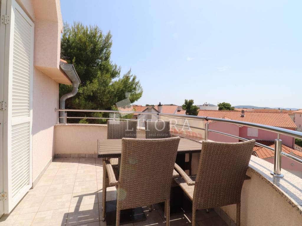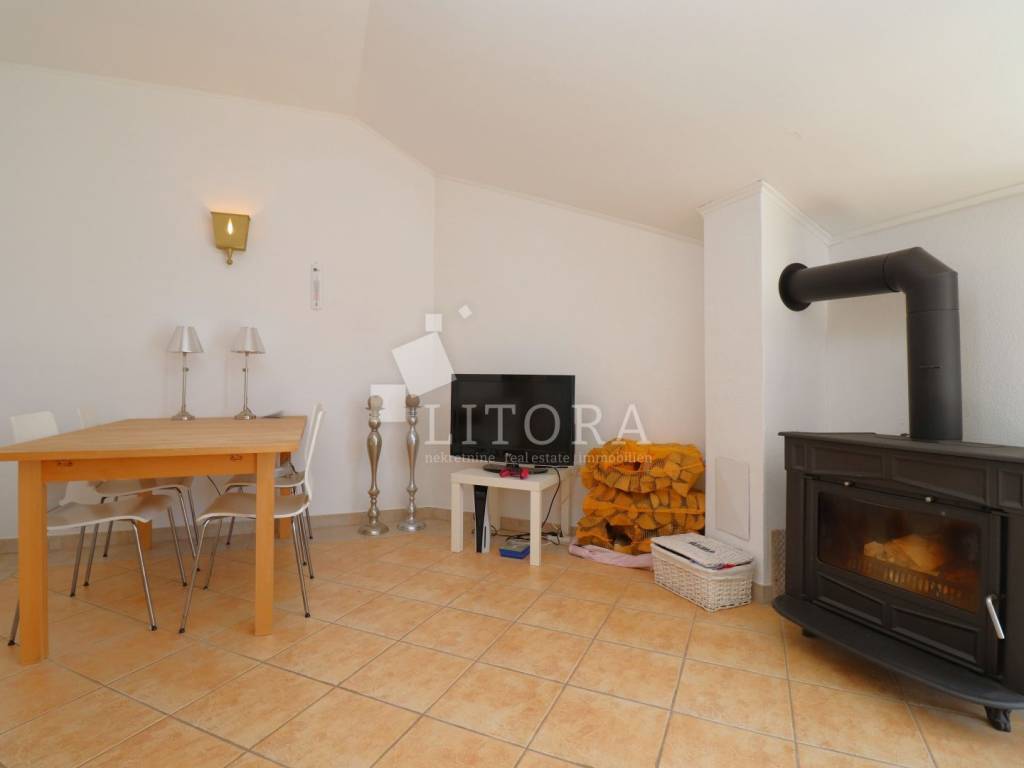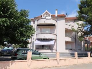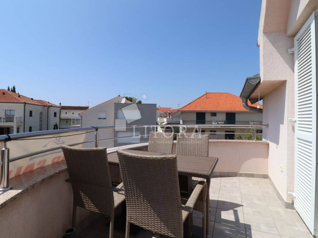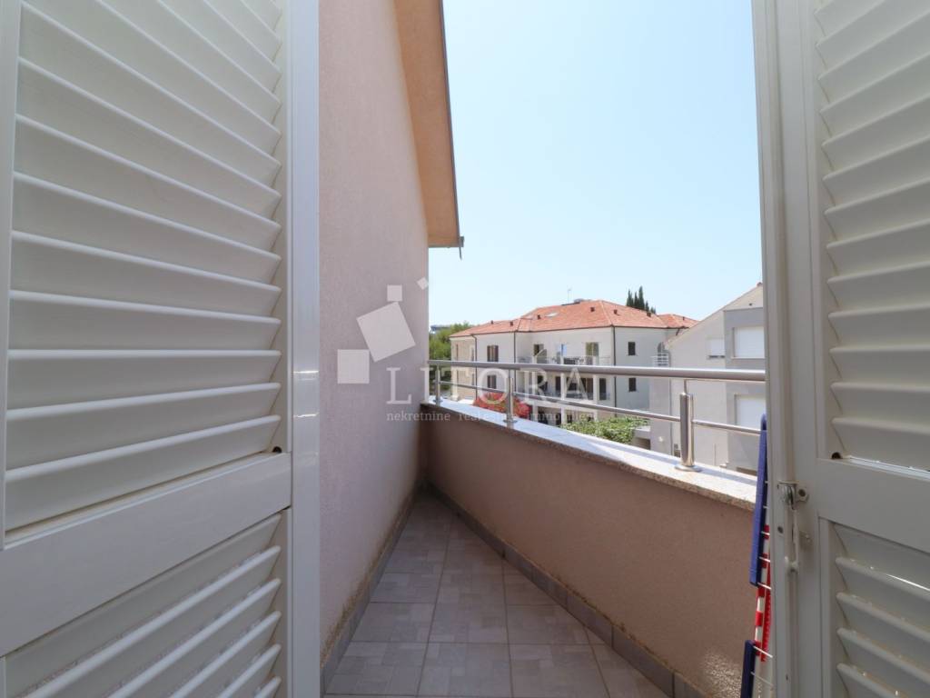 Fully furnished and spacious apartment loca-ted on the second floor / attic of a residential building, just 430 meters from the beach. The apartment is south-facing and has a net usa-ble area of 97.66 m². It consists of a hallway, storage room, bathroom, separate toilet, two bedrooms (one of which has its own balcony), and a spacious living room with kitchen and dining area, with access to a large terrace. Thanks to its practical layout, the apartment can easily be converted into a three-bedroom unit with minor modifications. It is equipped with an air conditioning unit and a wood-burning fireplace, making it comfortable for year-round living. The apartment is sold fully furnished, with all furniture included in the price. One designated parking space is inclu-ded. The city center is 1,180 meters away.