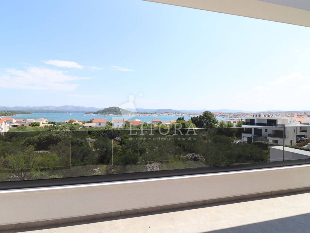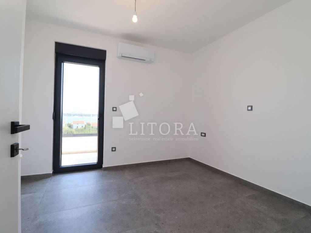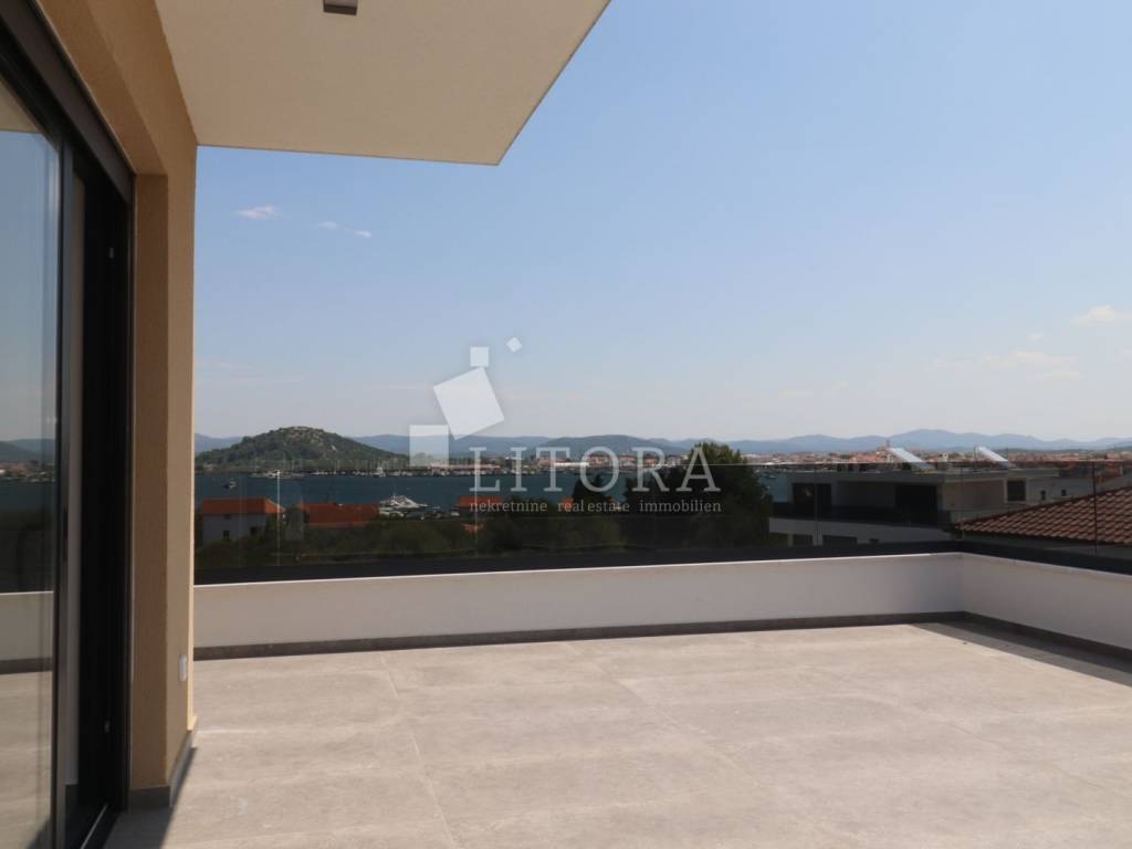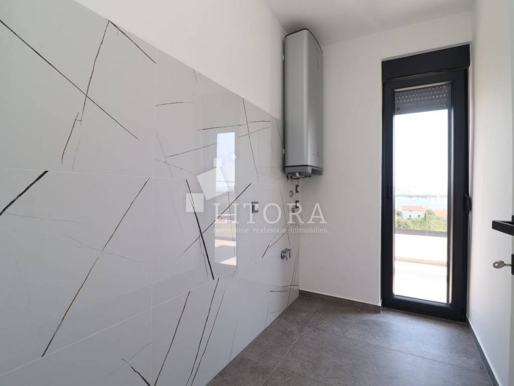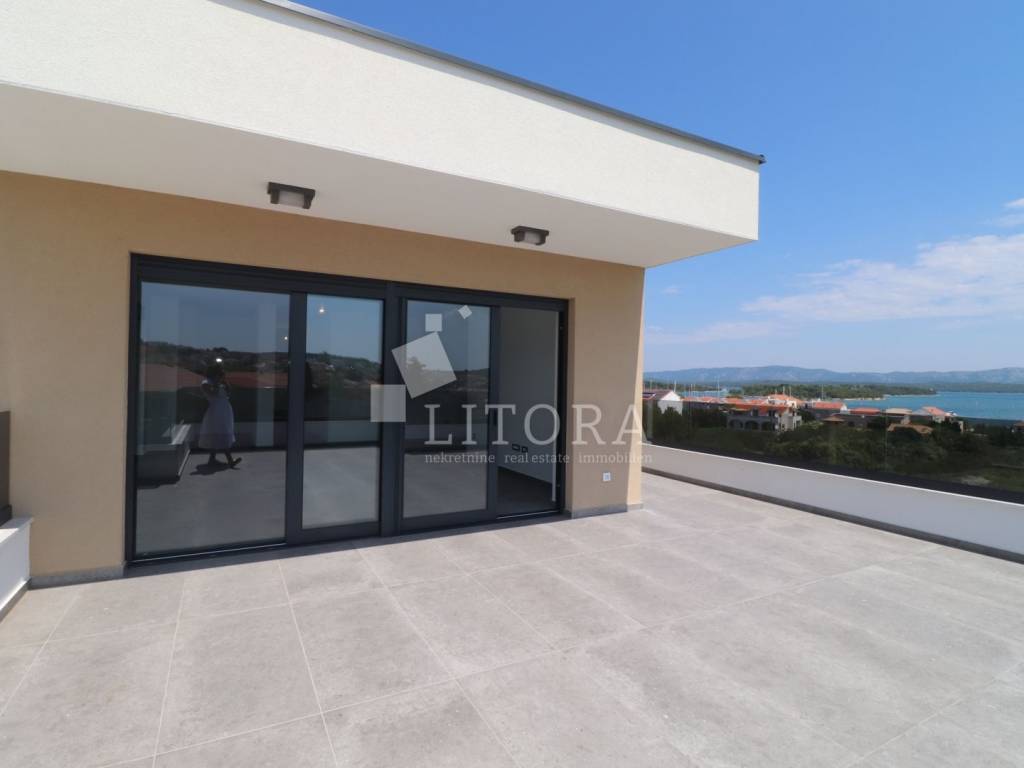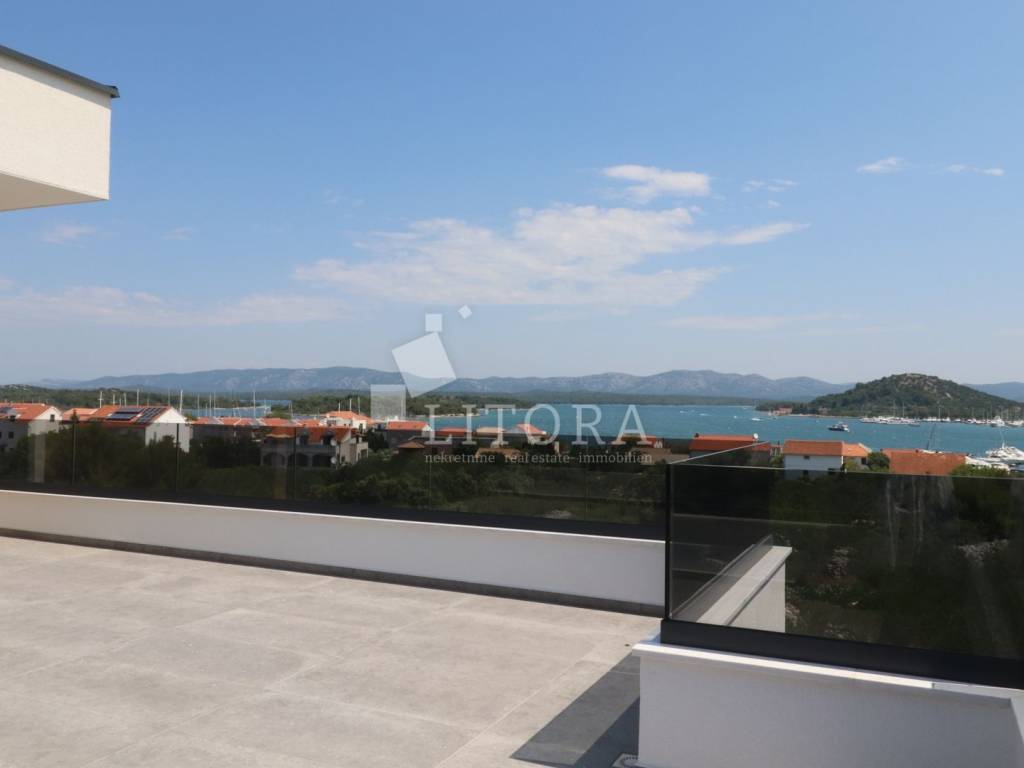 Murter Island – Penthouse with Four Terraces and Panoramic Sea View. Penthouse occupying the entire second floor of a smaller residential building on the island of Murter, with a total usable area of 124.95 m². The apartment consists of three bedrooms, one of which has its own bathroom, and each bedroom has access to a terrace. There is also a bathroom, laundry room, hallway, and a spacious living room with dining area and kitchen, with access to two large terraces of 45.57 m² and 11.04 m². All four terraces offer open views of the sea and the town of Murter. The apartment includes two outdoor parking spaces. It is ready for immediate occupancy and is equipped with security doors, air conditioning in all rooms, electric shutters, and mosquito nets.