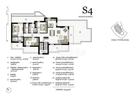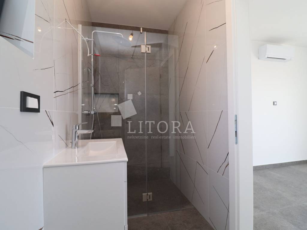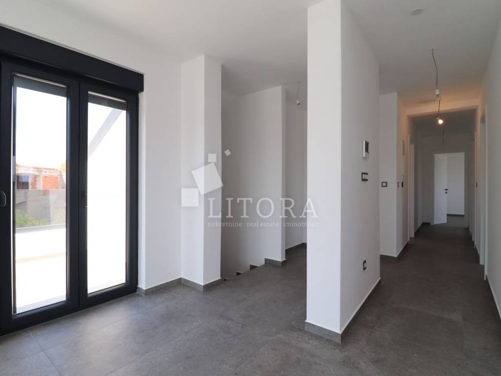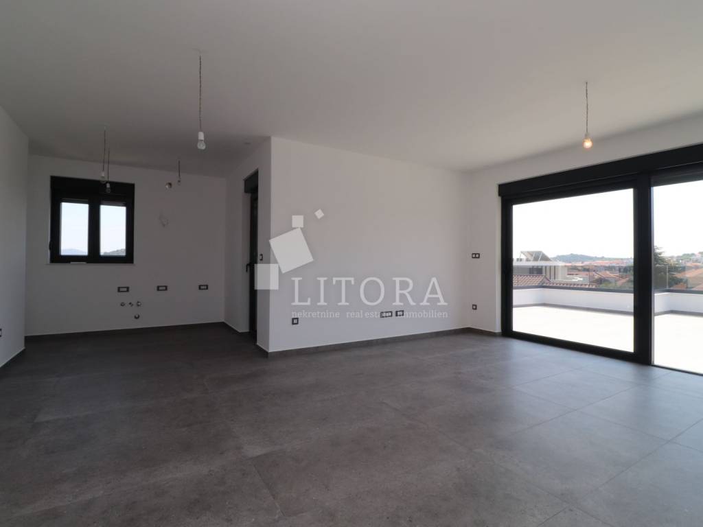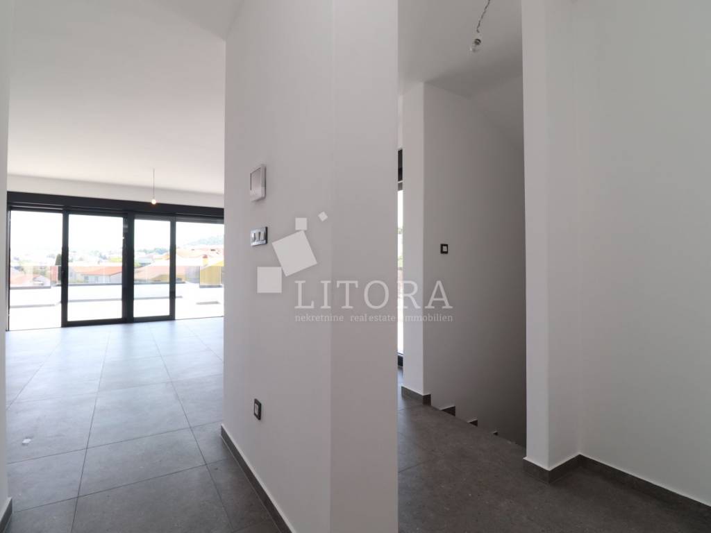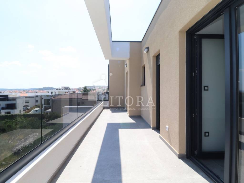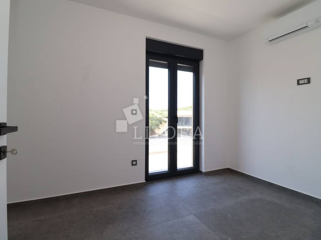 Murter Island – Penthouse with Four Terraces and Panoramic Sea View. Penthouse occupying the entire second floor of a smaller residential building on the island of Murter, with a total usable area of 124.95 m². The apartment consists of three bedrooms, one of which has its own bathroom, and each bedroom has access to a terrace. There is also a bathroom, laundry room, hallway, and a spacious living room with dining area and kitchen, with access to two large terraces of 45.57 m² and 11.04 m². All four terraces offer open views of the sea and the town of Murter. The apartment includes two outdoor parking spaces. It is ready for immediate occupancy and is equipped with security doors, air conditioning in all rooms, electric shutters, and mosquito nets.