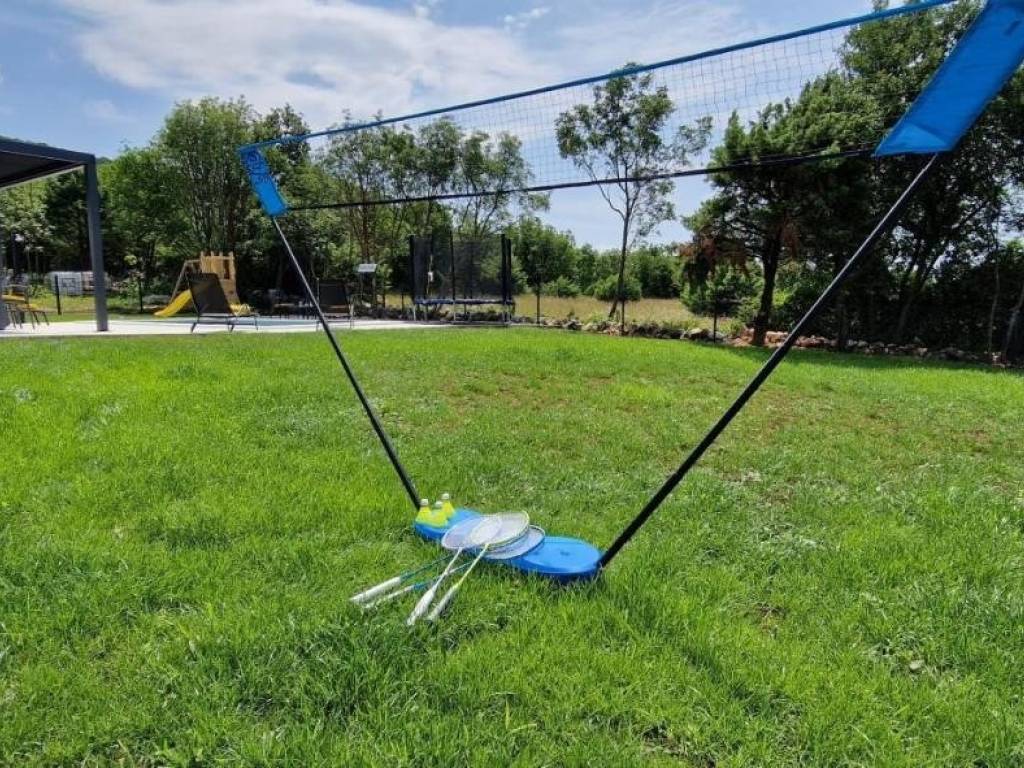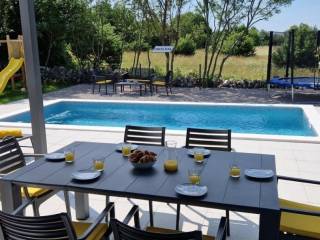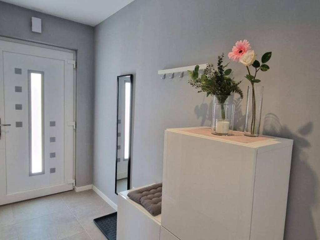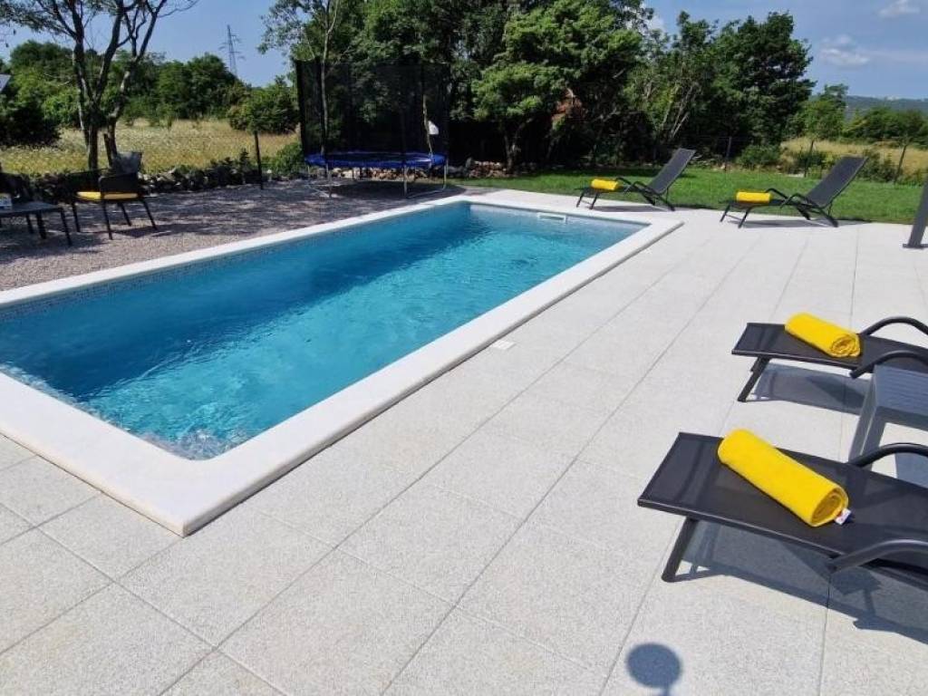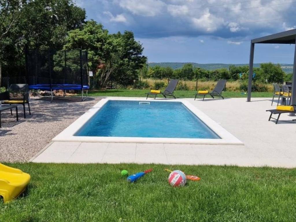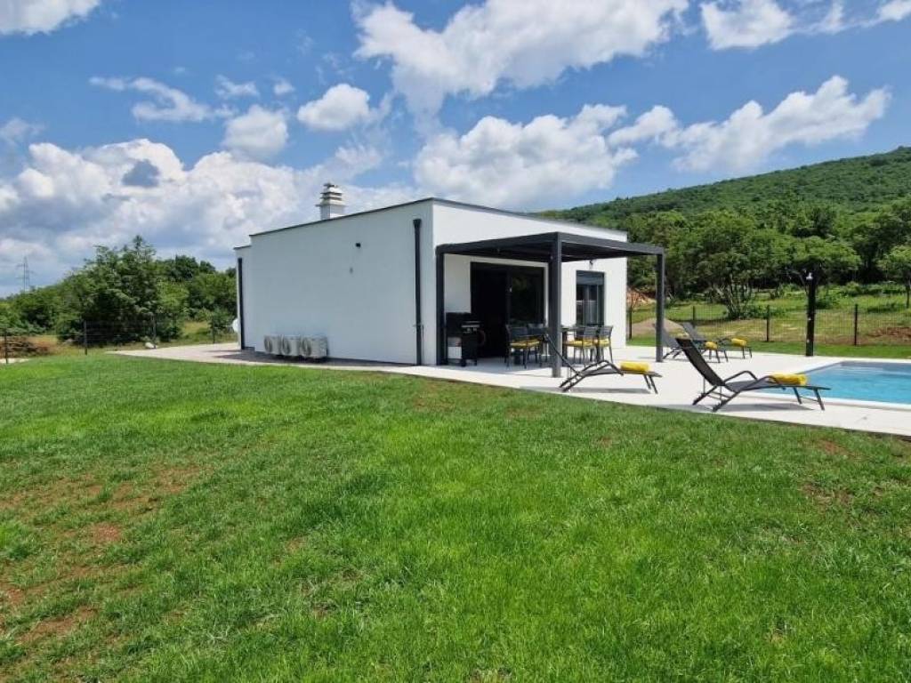 Near Labin, there is this nice prefab house of 87 m2 with a swimming pool, surrounded by nature and with a well-established rental business. It is located in a quiet settlement, only three kilometers from the sea and beaches. It consists of a living area with a kitchen, a dining room and a living room connected to the outside space by glass walls, two bedrooms, two bathrooms and a storage room. Heating/cooling of the house is provided by air conditioners, and there is an opening for a fireplace in the living room. Next to the house, there is a 21 m² swimming pool with a paved sunbathing area and a children's playground in the fenced and landscaped garden. The house is in the phase of obtaining a use permit. More on request.