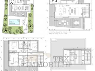 The garden is fully fenced and offers complete privacy. In the central part there is a swimming pool with a sunbathing area, a covered 55 m² terrace, and an outdoor fireplace, perfect for enjoyment throughout the year.
