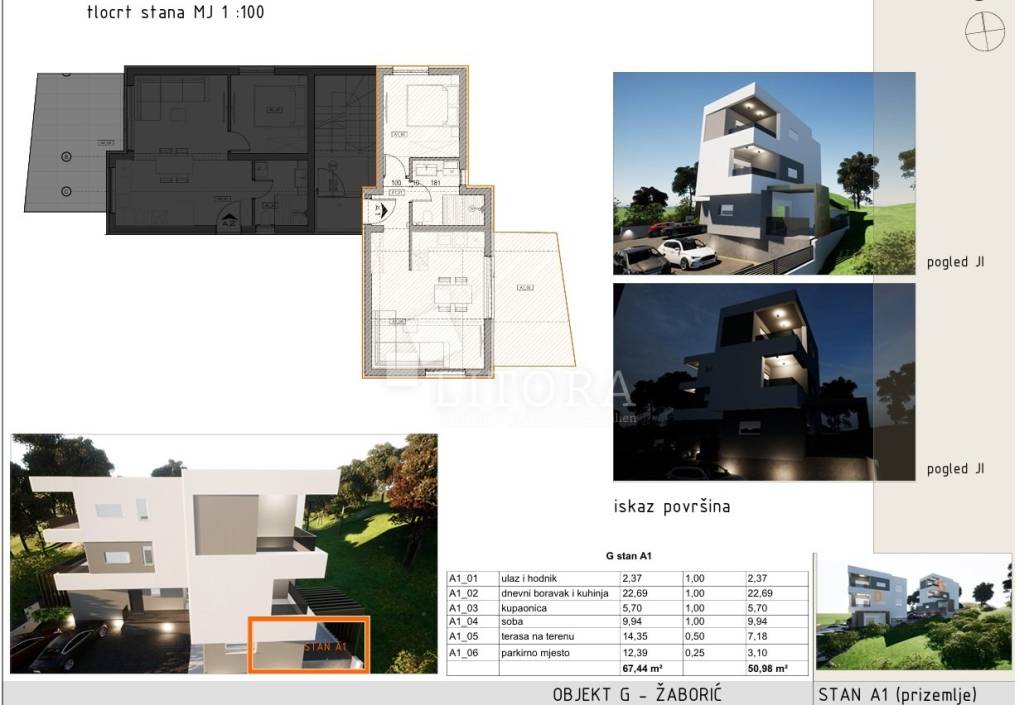 Žaborić – Newly Built Apartment with Sea View, 450m from the beach. This newly built apartment offers 50.98 m² of usable living space and is located in a small residential building. It is situated on the south-east side, providing a beautiful sea view. The layout includes a hallway, bathroom, bedroom, and an open-plan living room with a dining area and kitchen, which opens onto an uncovered terrace of 14.35 m². The apartment is equipped with security doors, air conditioning in each room, electric shutters, and mosquito nets. It also comes with one outdoor parking space. The apartment is located just 450 meters from both the beach and the town center.