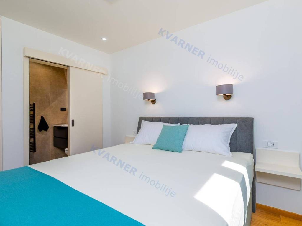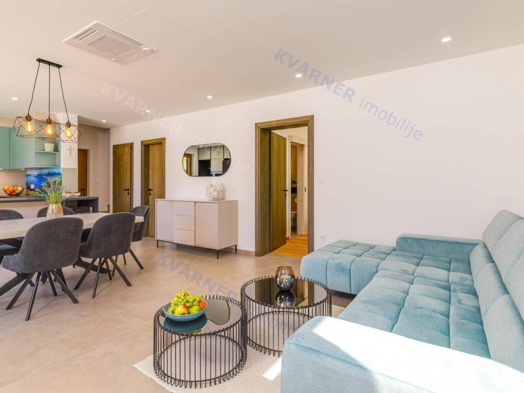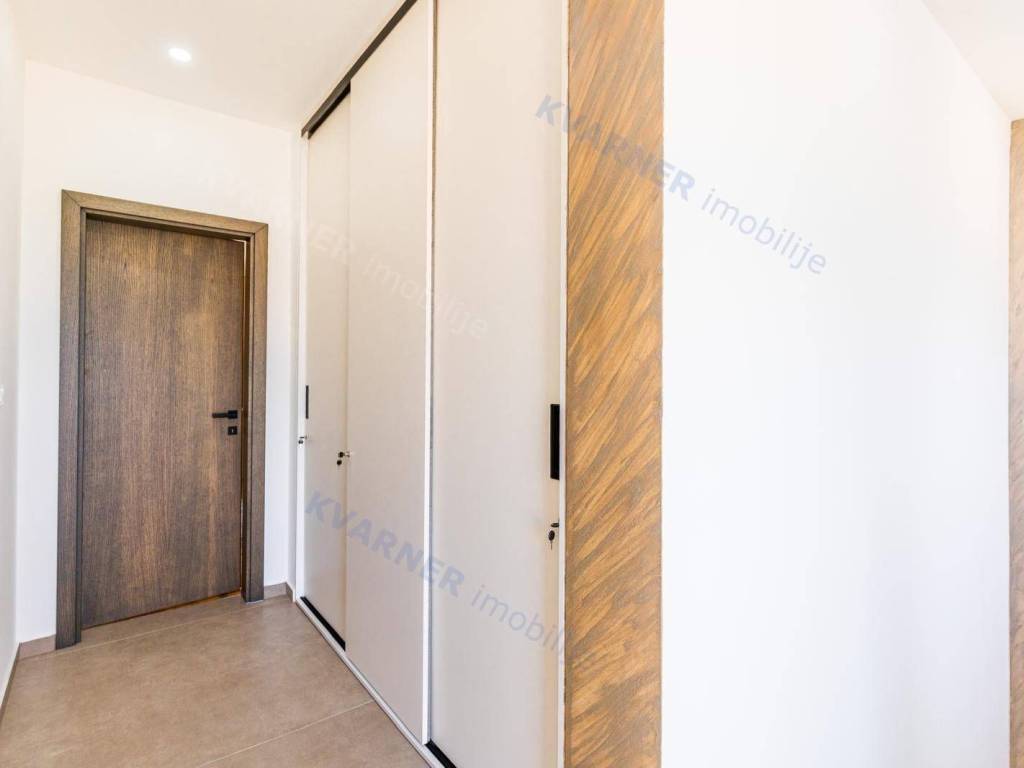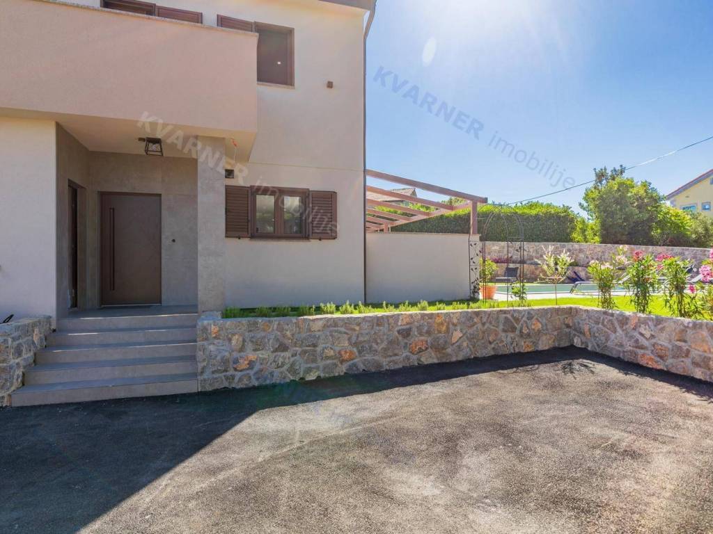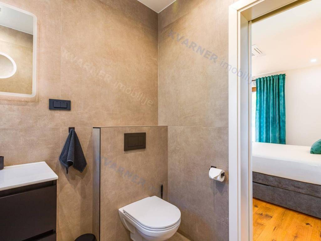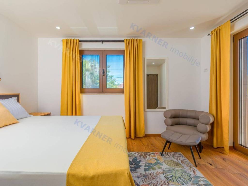 All rooms have central air conditioning and underfloor heating. The bedrooms feature high-quality oak parquet, while other areas are tiled with premium ceramics. A stone wall along the staircase adds a traditional touch, reminding of the spirit of Krk Island.