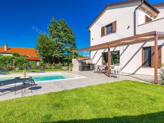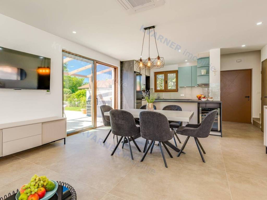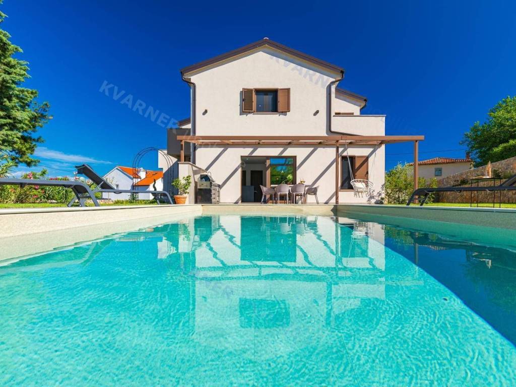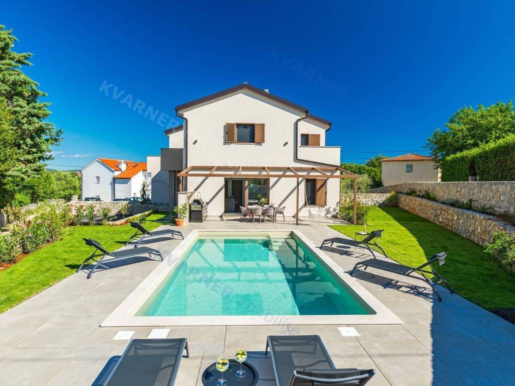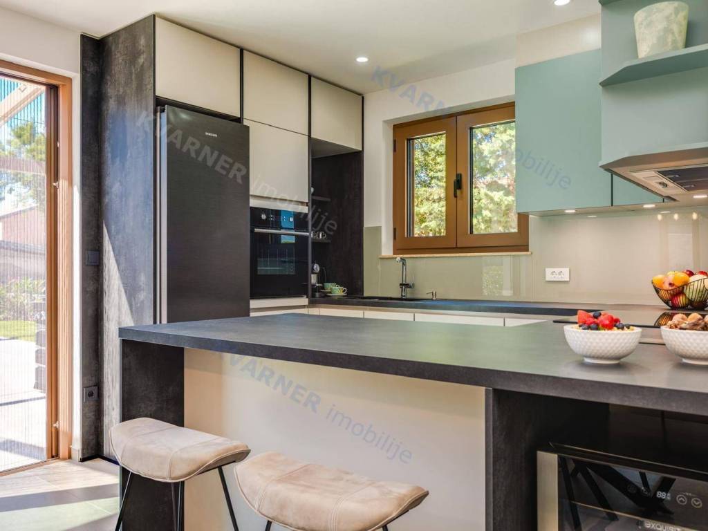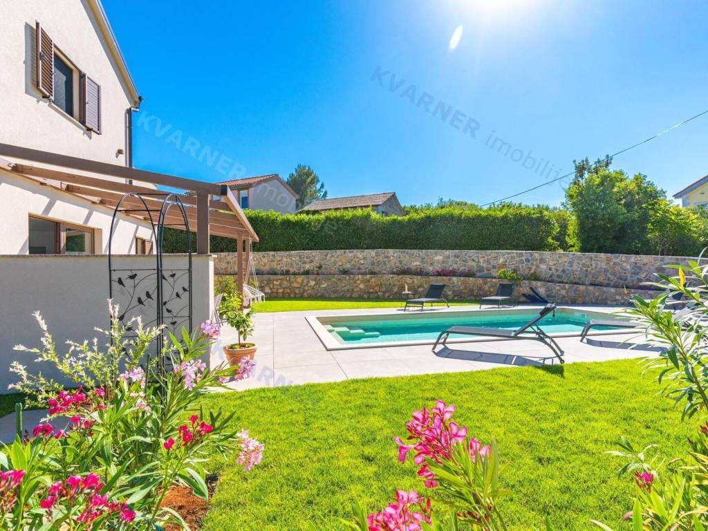 All rooms have central air conditioning and underfloor heating. The bedrooms feature high-quality oak parquet, while other areas are tiled with premium ceramics. A stone wall along the staircase adds a traditional touch, reminding of the spirit of Krk Island.