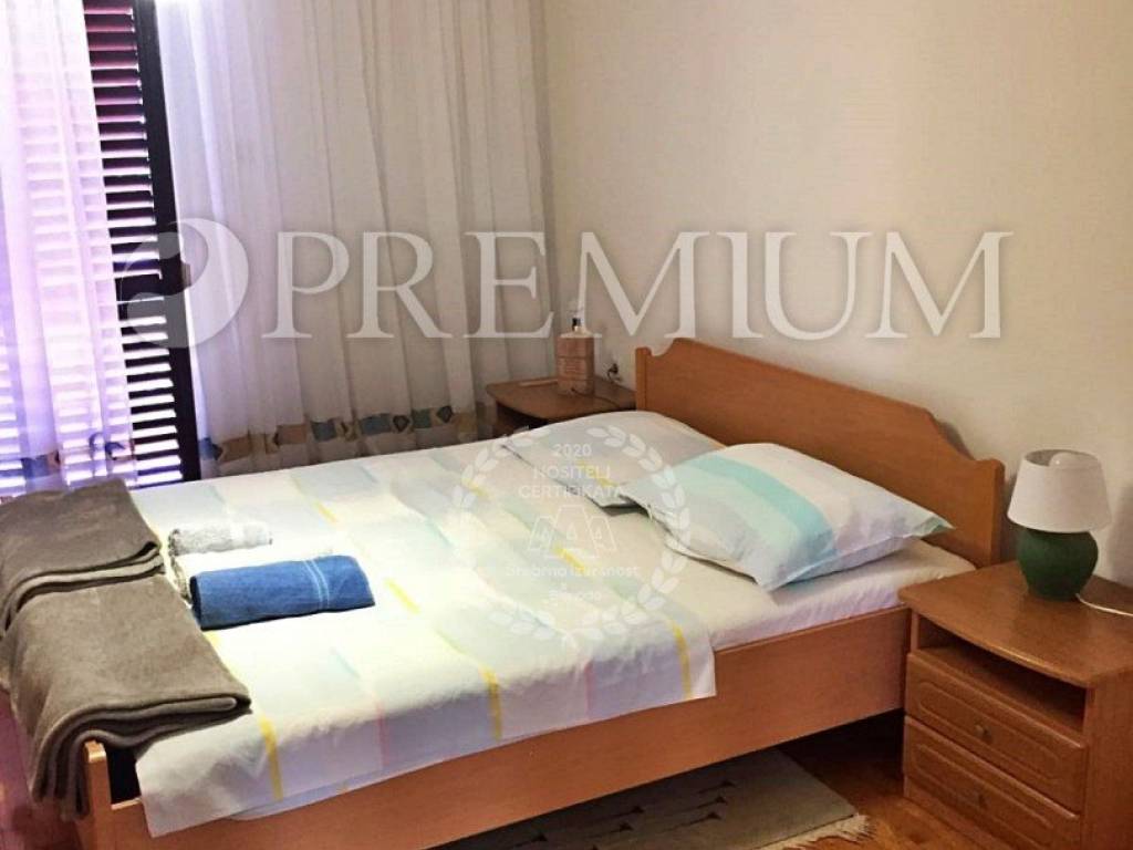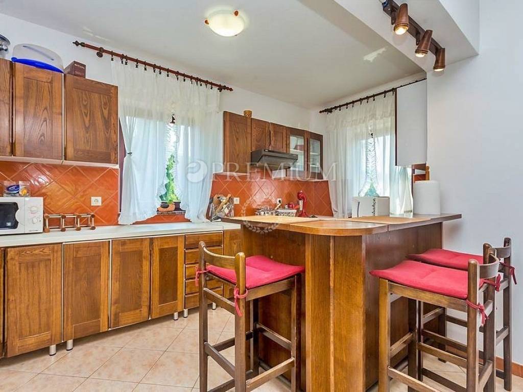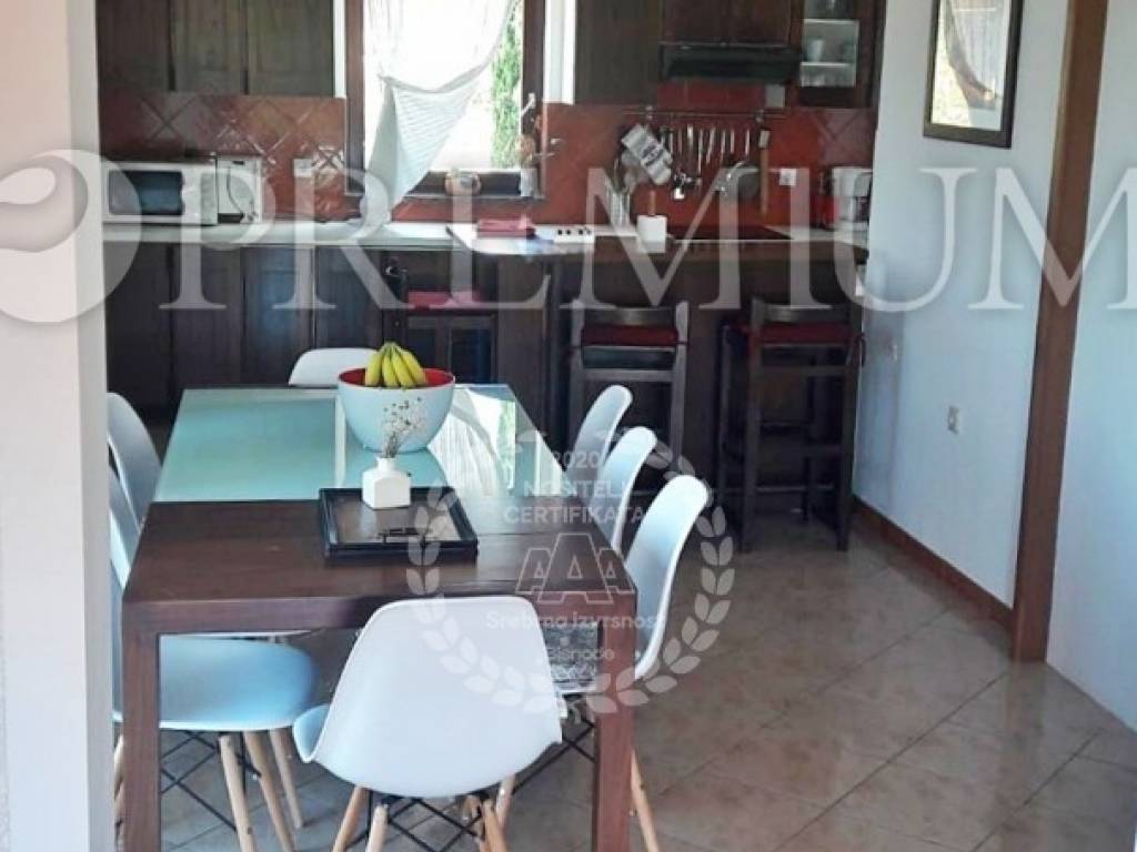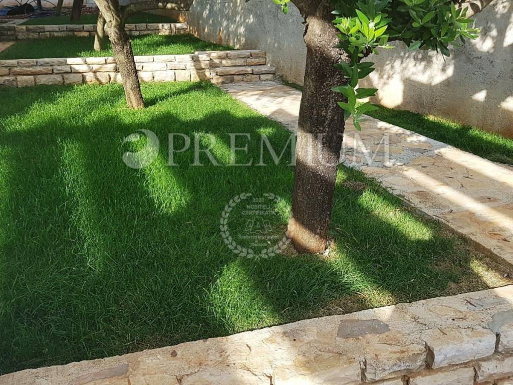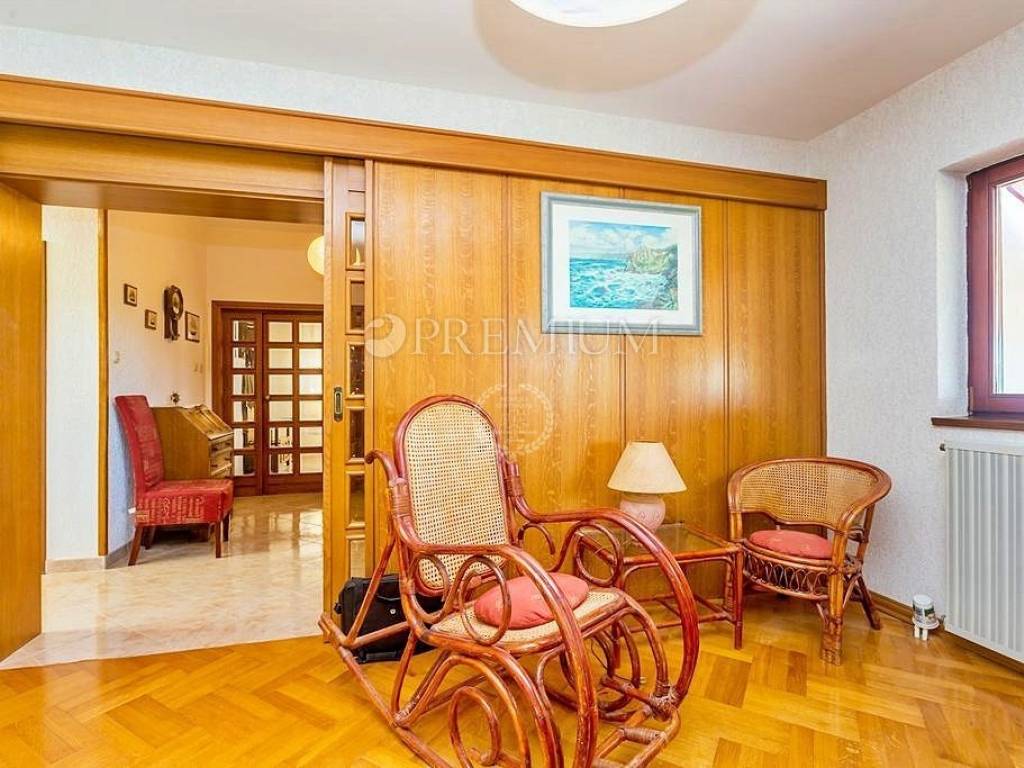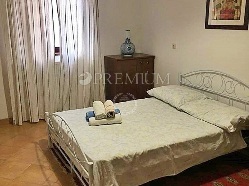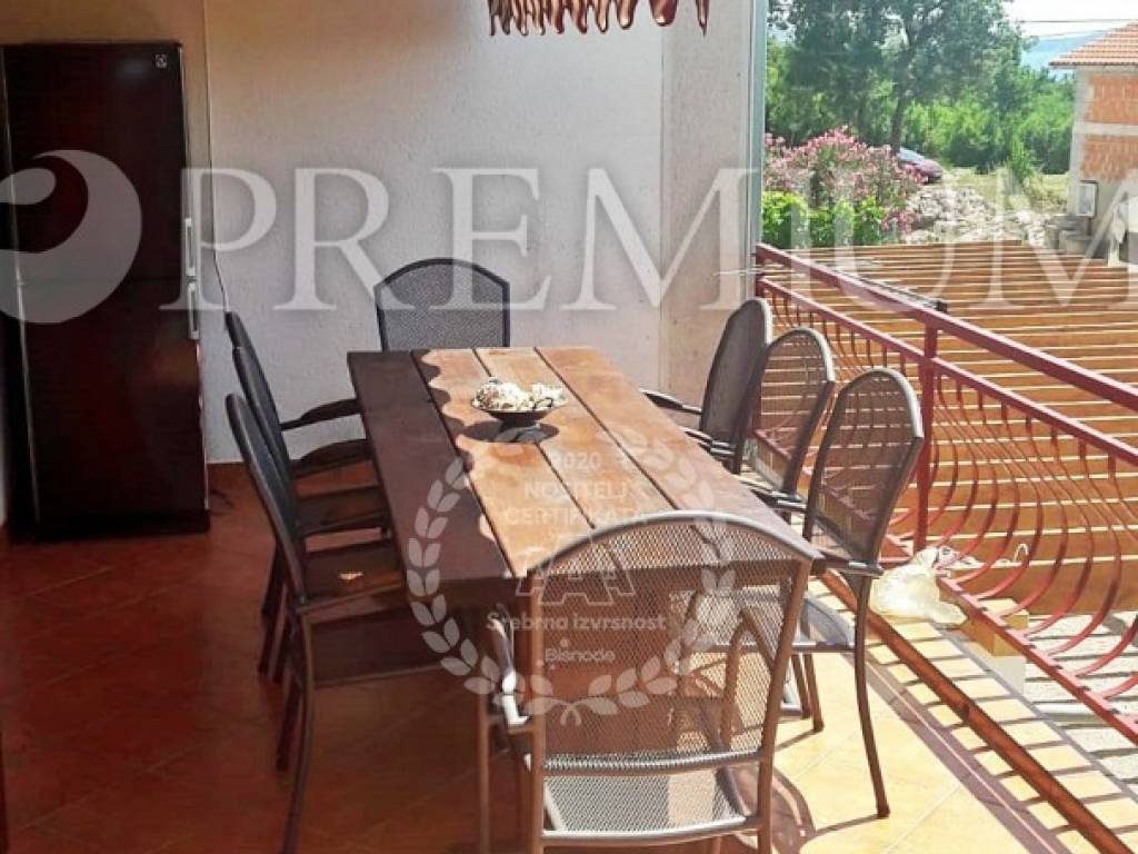 Krk, surroundings, sale of detached family house of total surface 290 m2 with 500 m2 garden built in 1988 and completely renovated in 2010. The house consists of the ground floor + floor + high attic. The ground floor consists of a studio apartment with terrace and two bedroom apartment with living room and terrace of 24 m2 and boiler room. On the first floor is a two-storey apartment consisting of living room with kitchen and dining room, two bedrooms, hallway and bathroom on the first floor, and on the second floor there are four bedrooms and a bathroom. One of these four rooms has kitchen installations. The loft is unmoved. The house is sold furnished and equipped, central heating with electricity, solar panels for heating water. It has a beautifully landscaped garden with an outdoor grill and four parking spaces. Possibility to build a swimming pool. Established for rent, 500 m from the sea.