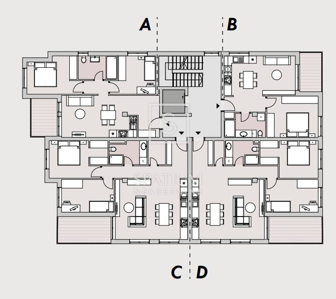REŠETARI, KASTAV, we offer an apartment in a new building with a total net area of 63.75 m2. It consists of an entrance hall, a living room with a kitchen and dining area that opens onto a loggia, a bathroom and a bedroom.