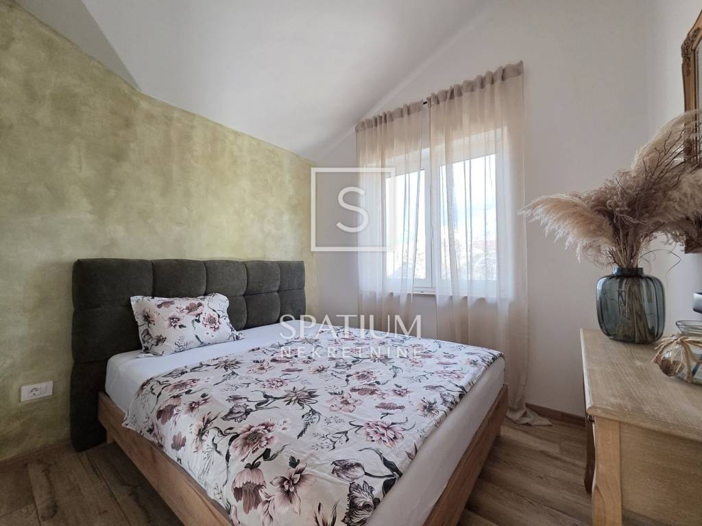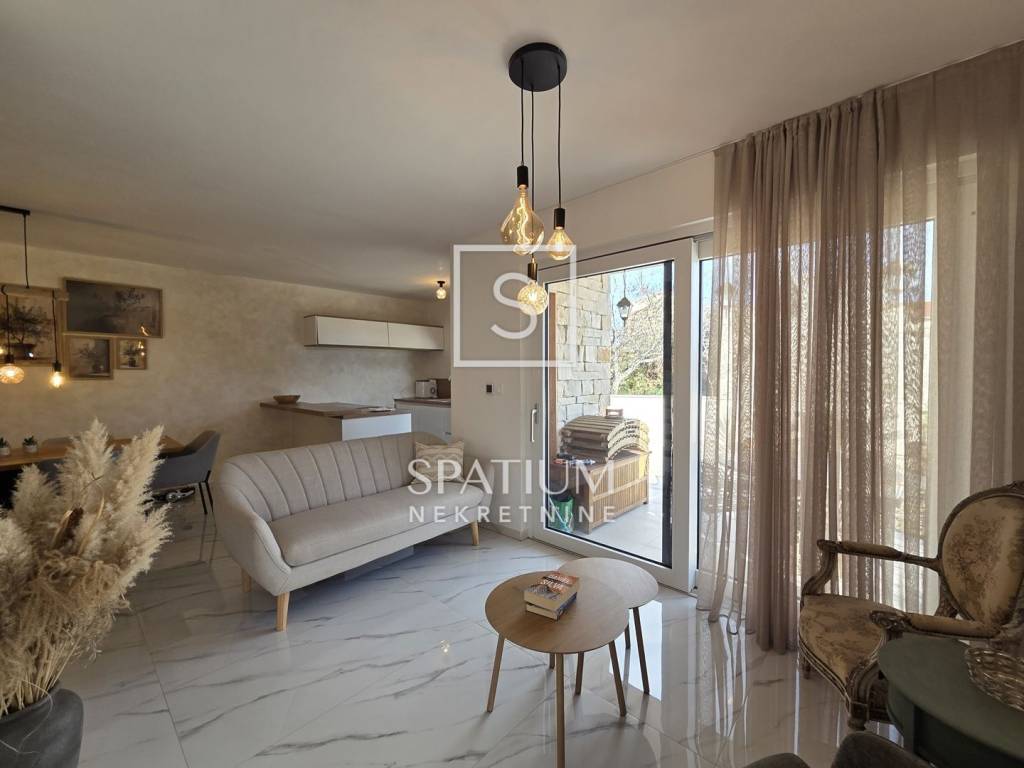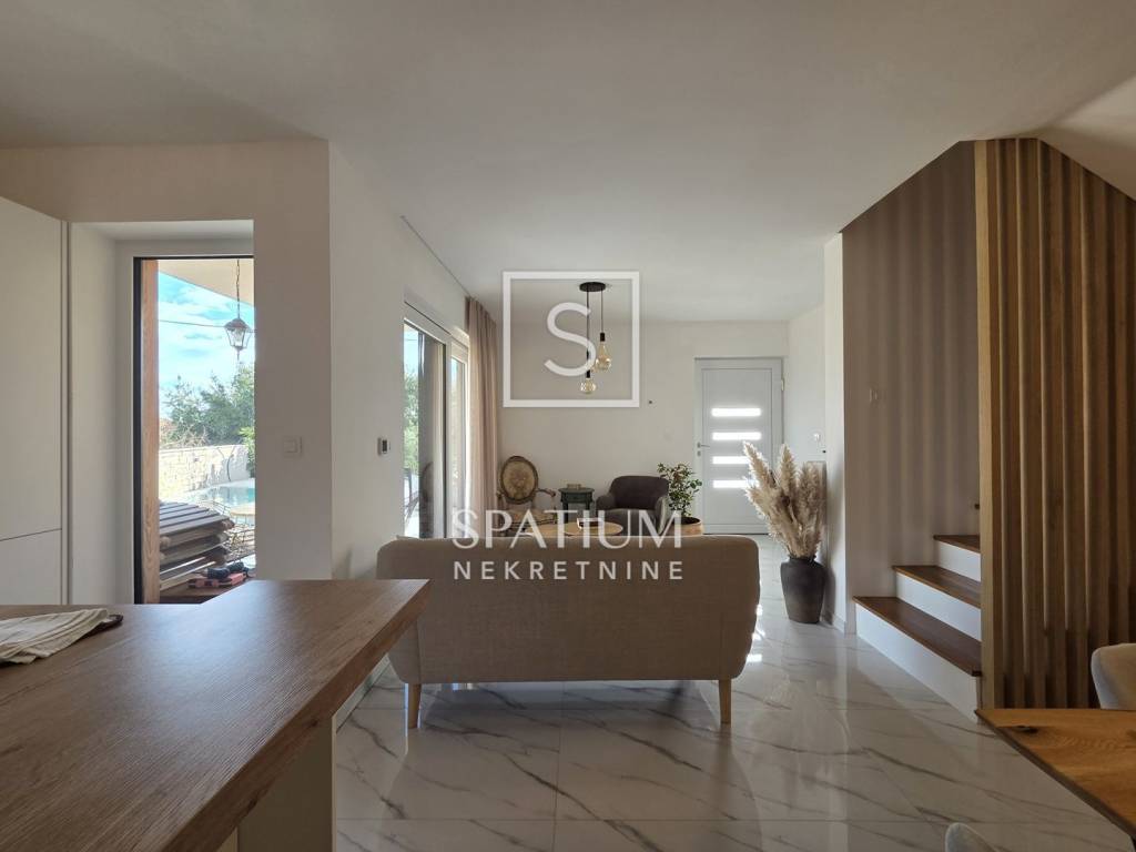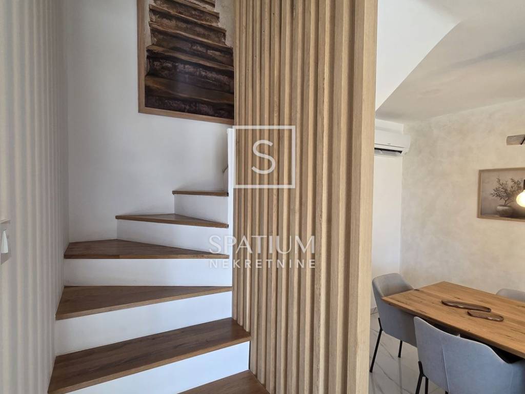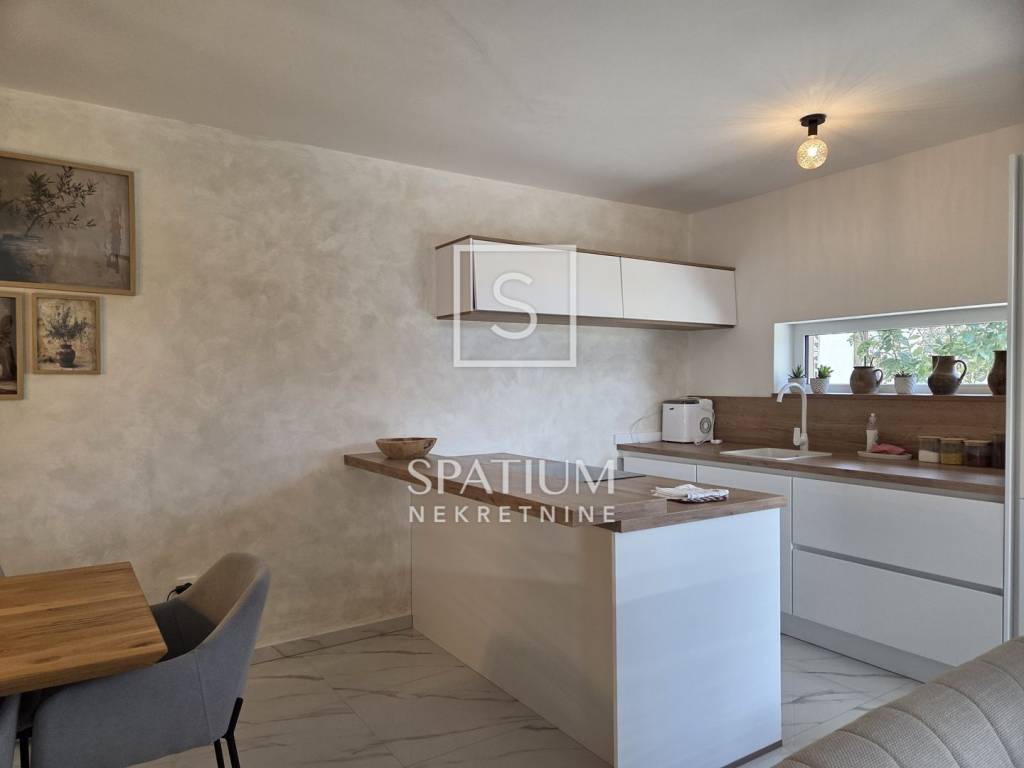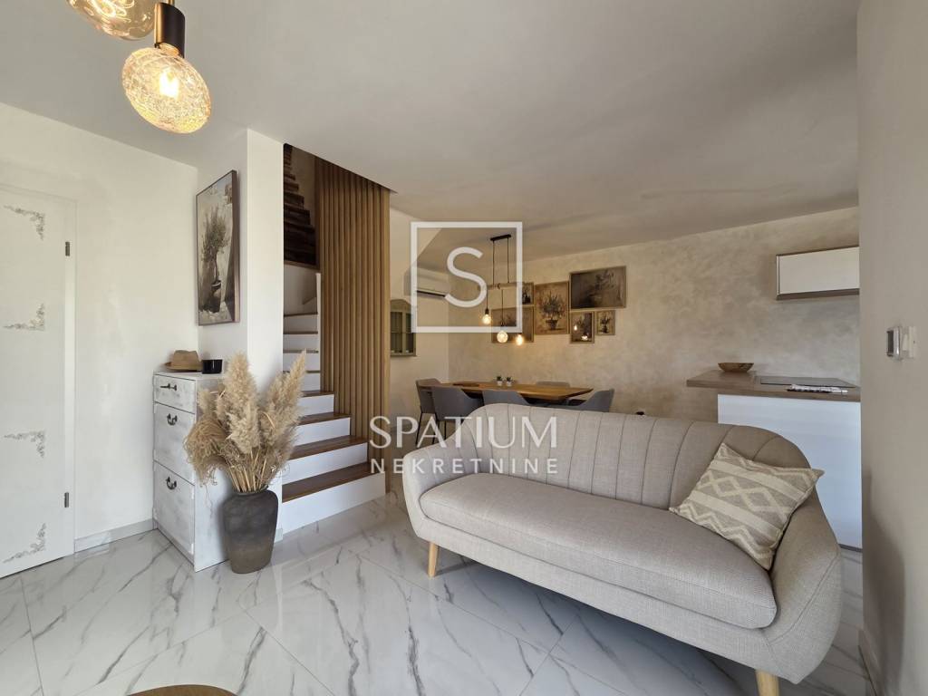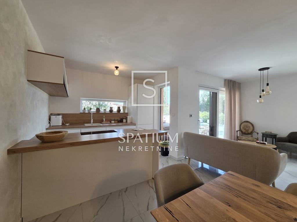 MARČANA, only with us we offer a three-bedroom duplex apartment in a house with two residential units, ideal for comfortable living or investment. The ground floor features a modern open-concept layout – kitchen, dining area and living room with direct access to the terrace. This level also includes a bathroom. The upper floor consists of three bedrooms and an additional bathroom. The apartment is equipped with underfloor heating throughout, two air-conditioning units, PVC and aluminium joinery, and thermal-insulated façade. The courtyard offers a fully arranged terrace with a summer kitchen, swimming pool and sunbathing area, as well as two private parking spaces. The property comes with clean ownership and complete documentation.