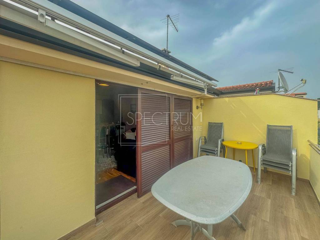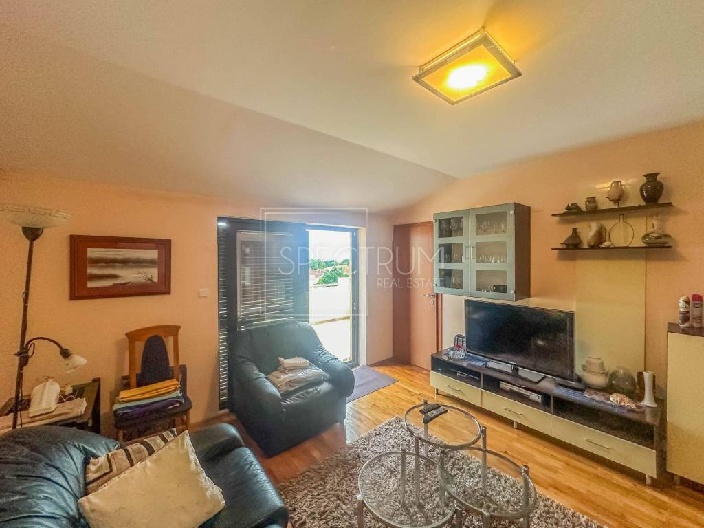 The apartment is located on the 2nd floor of a smaller residential building. The area of ​​the apartment is 71.05 m2. The apartment consists of an open space living room with kitchen and dining room, 2 bedrooms, bathroom, hallway and 2 balconies. One smaller balcony is accessed from one bedroom, and another larger balcony is accessed from the living room. The larger balcony is ideal for enjoying the outdoors, and the balcony offers a wonderful open view of the sea and Novigrad. The apartment also has an attic space, which can be used as a storage room, and can be used in various other ways, depending on the wishes of the new owner. The layout of the rooms is very good and practically every part of the apartment is used smartly. The apartment is heated with an air conditioner, and there is a possibility of installing a wood stove.