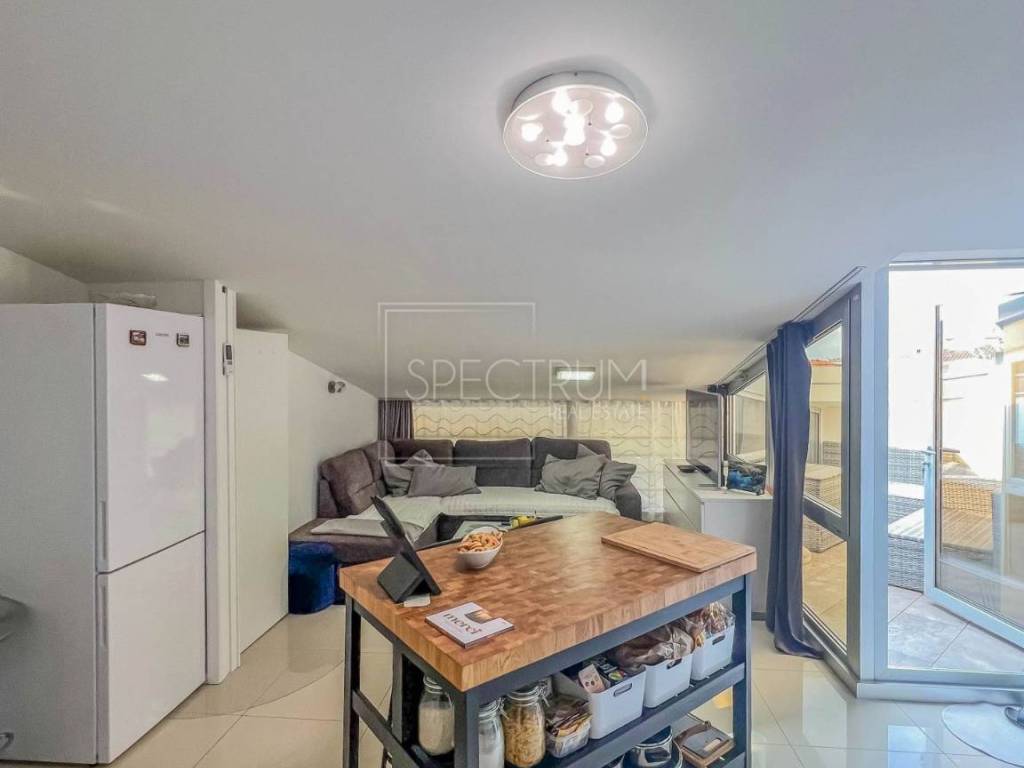 The apartment is located on the 3rd floor, also the attic of a residential building with an elevator. The area of the apartment is 40.65 m2. The apartment consists of a living room with a kitchen and a dining room, a bedroom, a bathroom, a storage room and a roof terrace. The roof terrace offers a view of the sea and the city of Novigrad. The layout of the rooms is very good and practically every part of the apartment is used smartly. The apartment is heated by an air conditioner. The apartment also owns a parking space, which is located right next to the entrance to the building.
