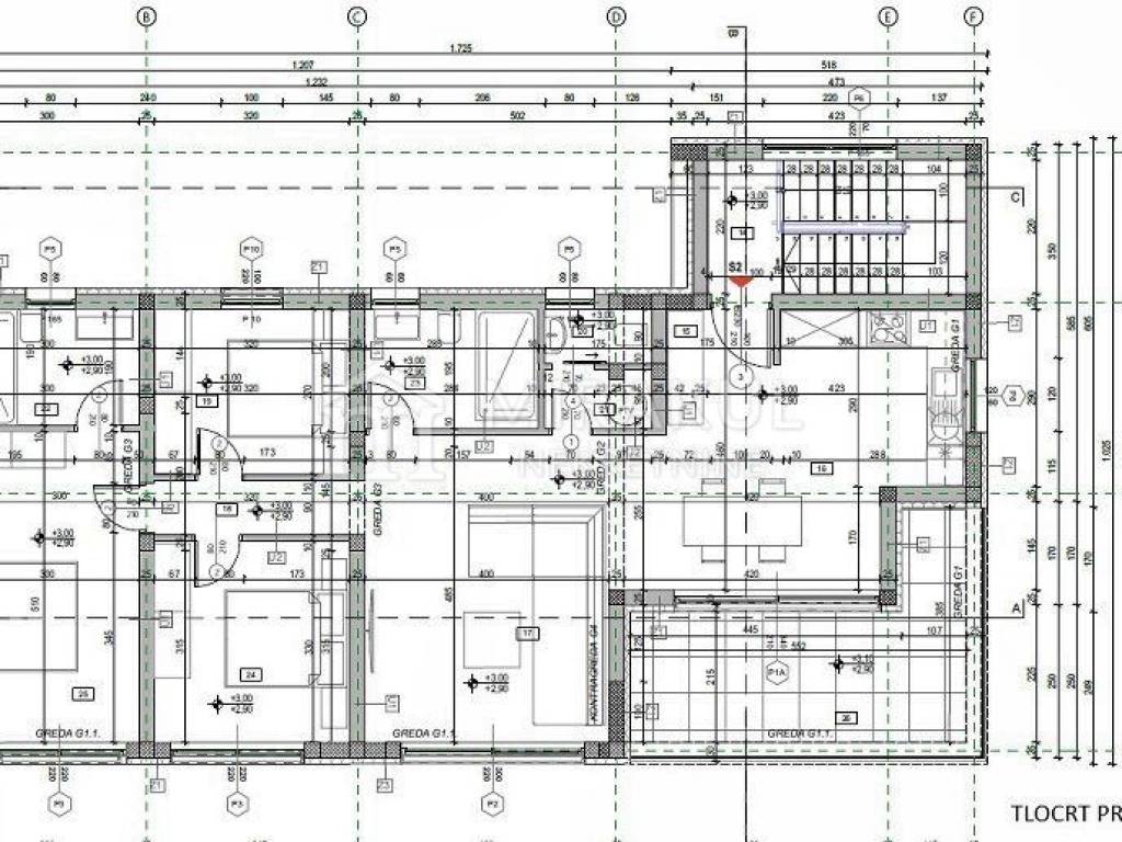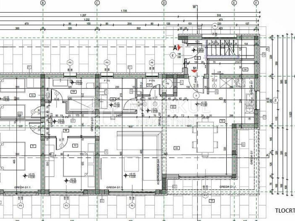 It consists of: staircase, hallway, kitchen, dining room, living room, hallway, toilet, two bathrooms, three bedrooms, terrace.