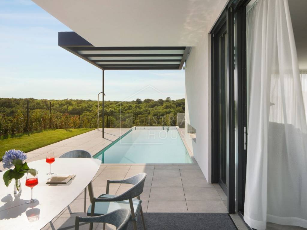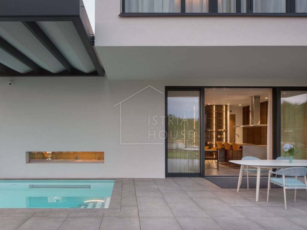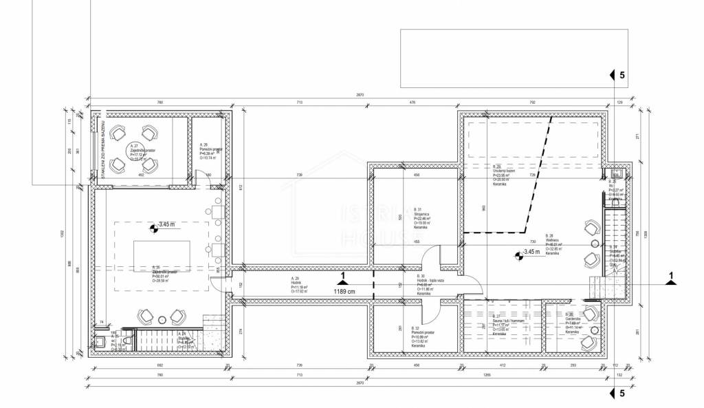 The houses are located on the same plot and are connected by a common basement where there are rooms for socializing and a wellness center, a sauna, an indoor heated pool, and additional rooms that serve as a machine room and a storage room.