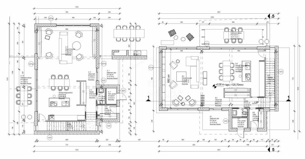 On the ground floor of one and the other unit, there are living spaces as large open units facing the sun and the outside part of the garden, consisting of a kitchen, dining room and living room.