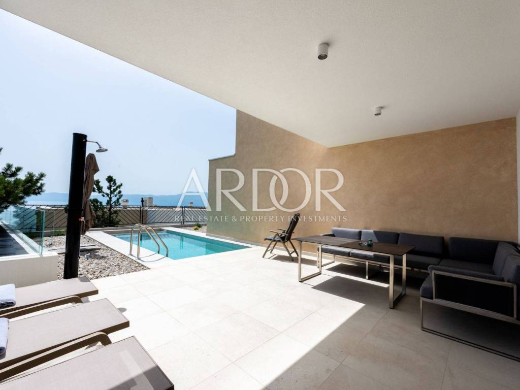 The villa consists of a living room, kitchen, and dining area in an open-plan space with access to a covered terrace and a pool. On the same floor, there is also a smaller bathroom. Internal stairs lead to the garage and boiler room or to three bedrooms, of which the master bedroom has its own bathroom and walk-in closet. On the upper floor, there is another larger bathroom and a south-facing terrace with panoramic sea views.