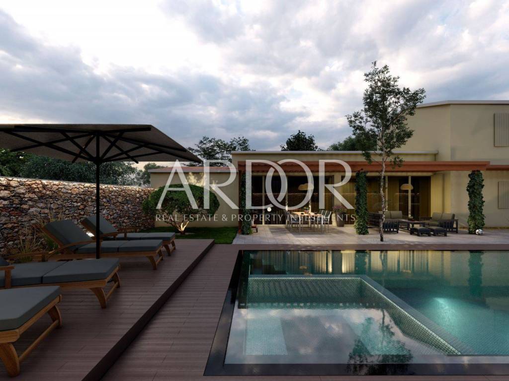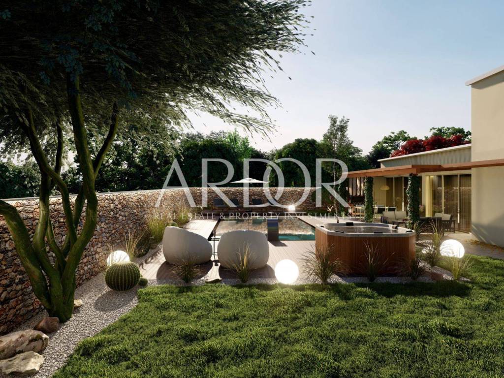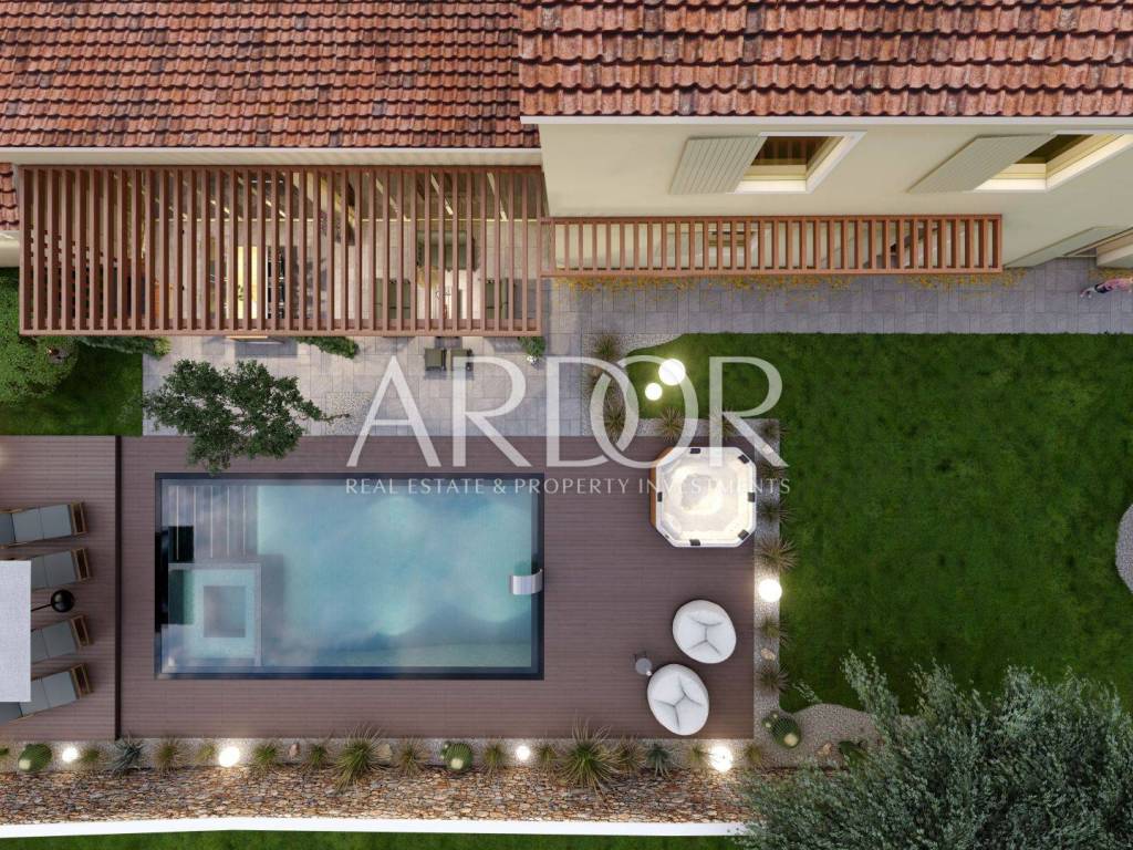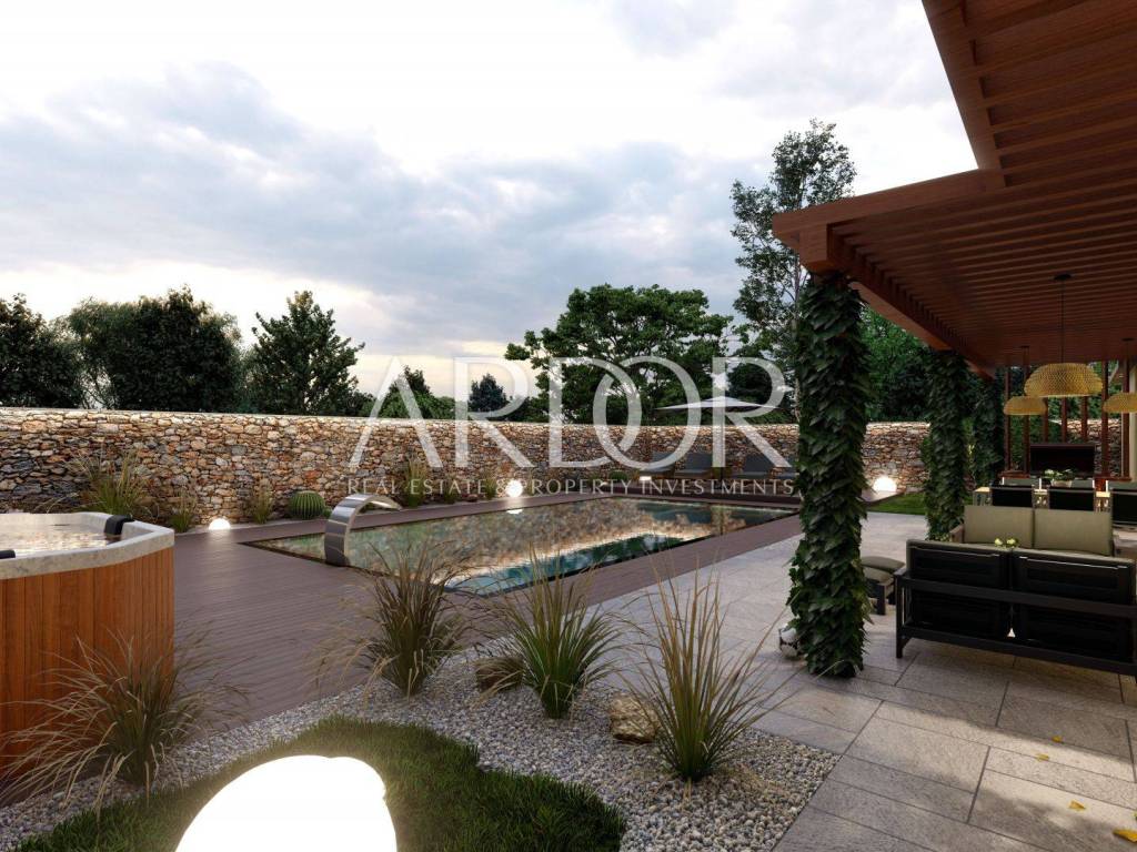 The exterior spaces of the house are equally impressive, with several covered and uncovered terraces that provide ample space for al fresco dining, relaxing and soaking up the sun. The central part of the outdoor area is designed for a 50 m2 swimming pool. The garden is carefully tended and adorned with a multitude of Mediterranean plants and trees, creating a harmonious blend of nature and architecture.