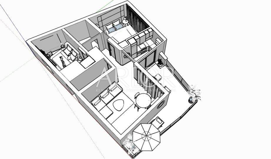 For sale: a three-bedroom apartment with garage in an excellent location, just steps from a well-maintained beach and private boat mooring. The apartment occupies the entire floor (101 m² gross floor area) and is situated on the first and top floor. It is connected via a private staircase to the ground floor, where the garage (17 m² net area) is located. The total surface area, including the staircase and garage, is 120.76 m². The property has clear ownership documentation, is owned by one person, and is immediately available for move-in. It is sold unfurnished.