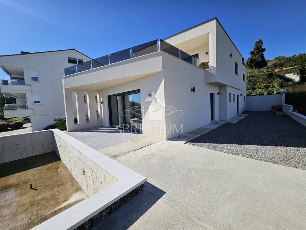 We are pleased to present this beautifully designed urban villa, located just a few minutes drive from the center of Lovran and only 300 meters from the sea and the Lungomare promenade. It is located in a cul-de-sac, surrounded by modern new buildings and is perfectly integrated into the Mediterranean landscape. Large glass walls allow for plenty of natural light, and spacious terraces offer magnificent views of the entire Kvarner.