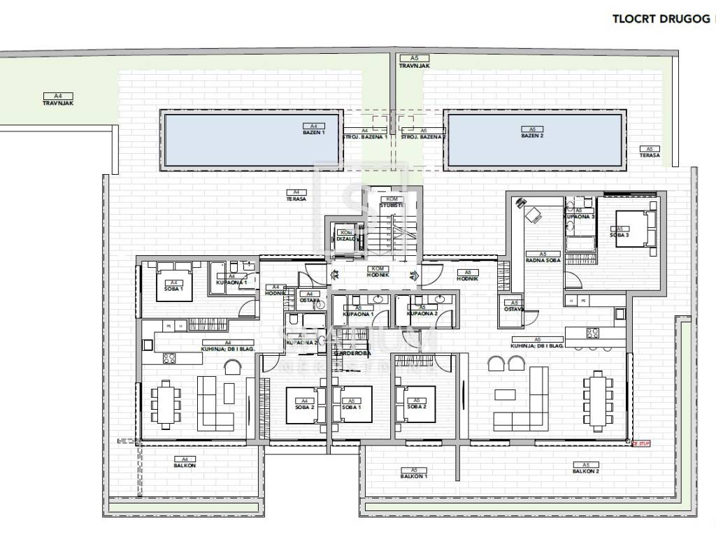 Apartment A5 is located on the second floor, with a total built area of ​​360 m2, of which 140 m2 is the interior, 63 m2 of the uncovered terrace, 22 m2 of the swimming pool, 6 m2 of the pool's engine room, 4 m2 of the storage room and 13 m2 of the garage parking space. The apartment also has a spacious garden of 112 m2.