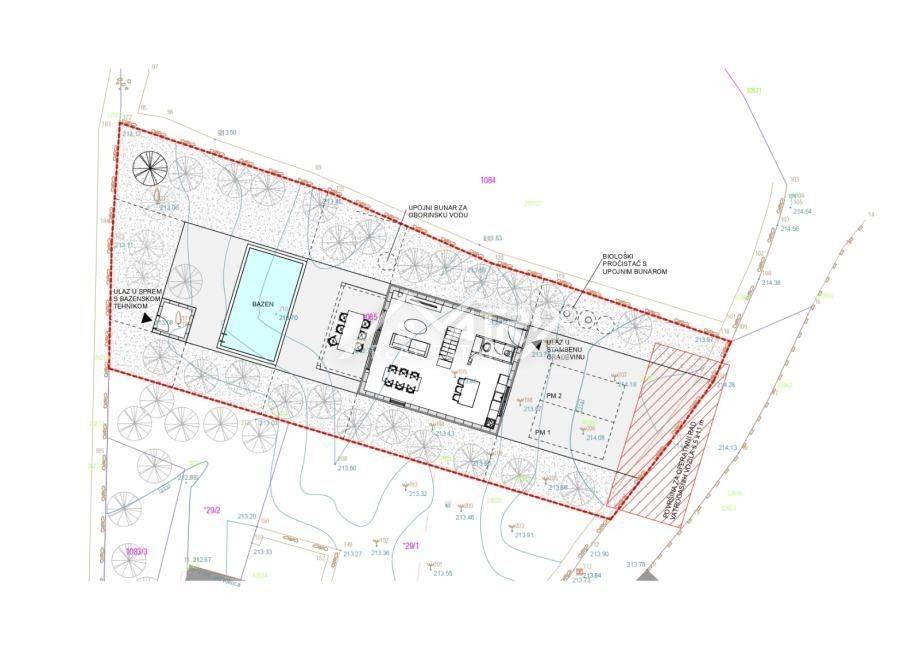 Zemljište od 547,43 m² ima pristup s javnog puta i okruženo je s dvije strane tradicionalnim suhozidima. Na parceli je predviđena gradnja moderno dizajnirane obiteljske kuće na dvije etaže, površine 120 m². U prizemlju je predviđen prostrani dnevni boravak, blagovaonica i kuhinja u konceptu otvorenog prostora, ostava, toalet i hodnik. Na katu su predviđene tri spavaće sobe, svaka s vlastitom kupaonicom, pružajući privatnost i udobnost. Uz to, kuća će imati prostranu vanjsku terasu od 40 m² i bazen površine 28 m². Na zemljištu će se nalaziti i dodatni objekti kao što su spremište za bazensku tehniku, biološki pročistač i dva parkirna mjesta.