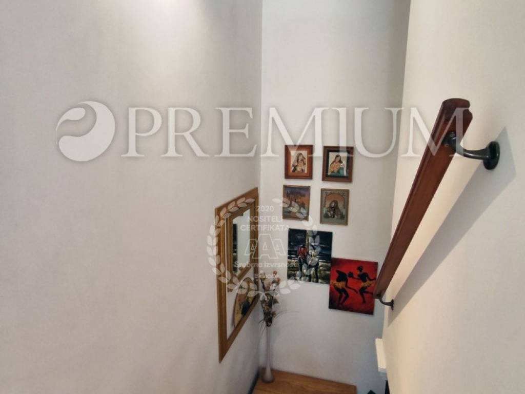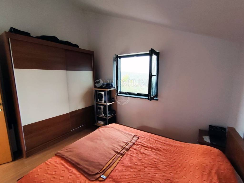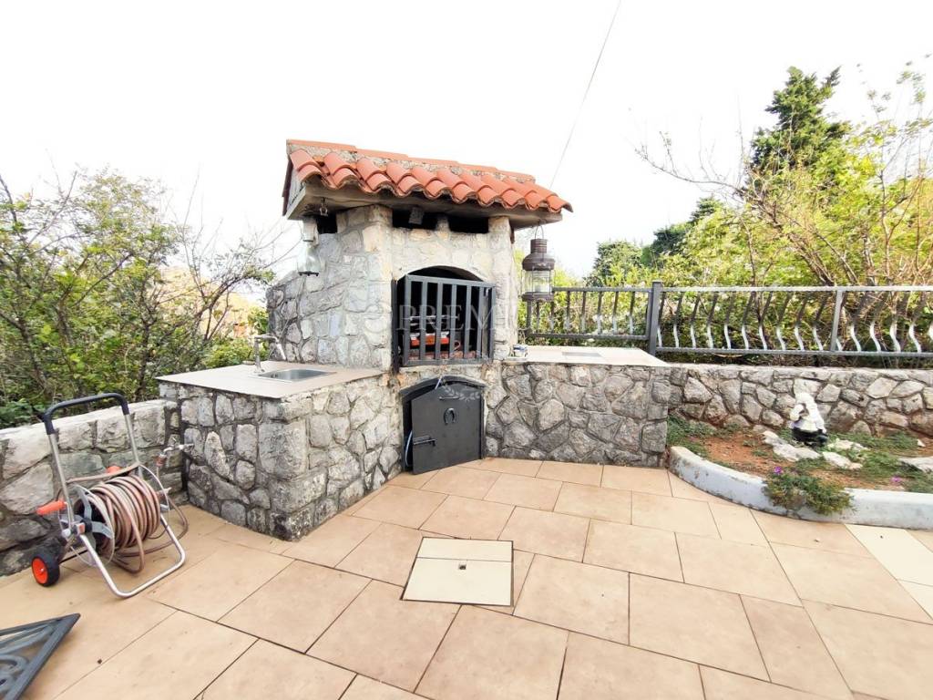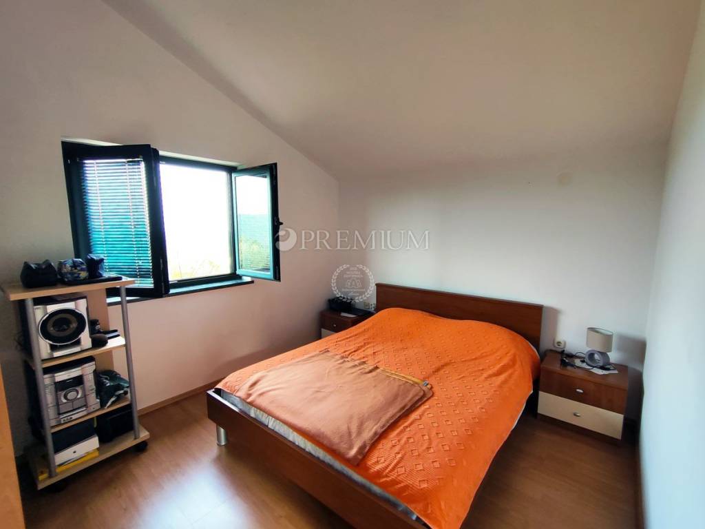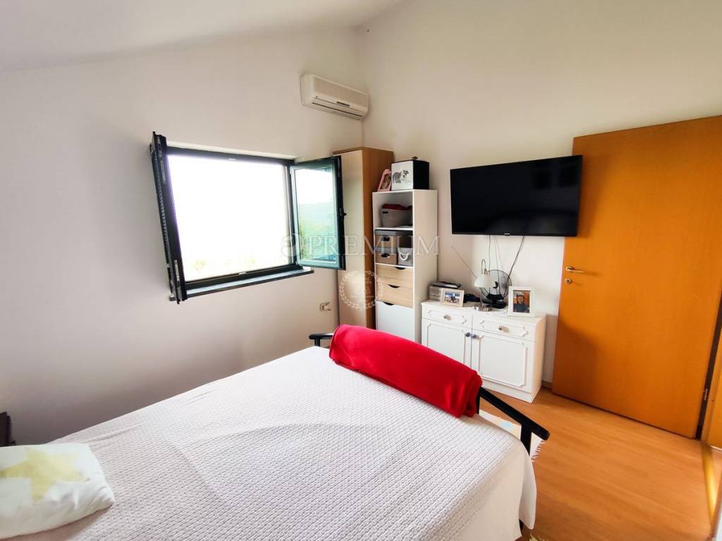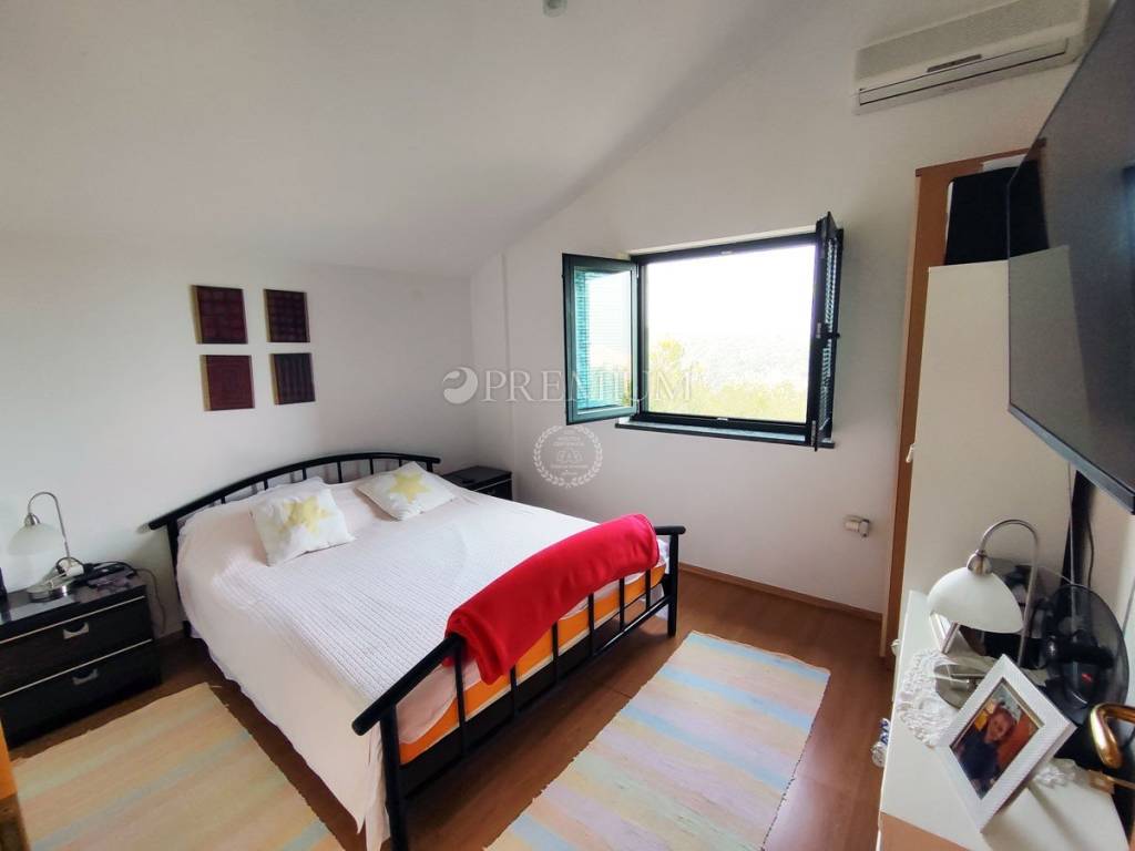 On the first floor, there is a hallway, two bedrooms, and one bathroom. At the end of the hallway is an exit to the terrace, offering a beautiful panoramic view of the sea and surrounding greenery. In the yard, covering 129m2, there is plenty of greenery and one parking spot.