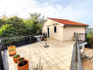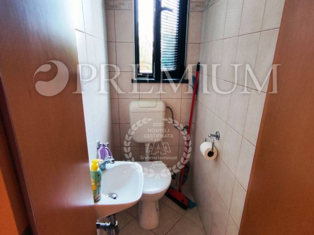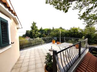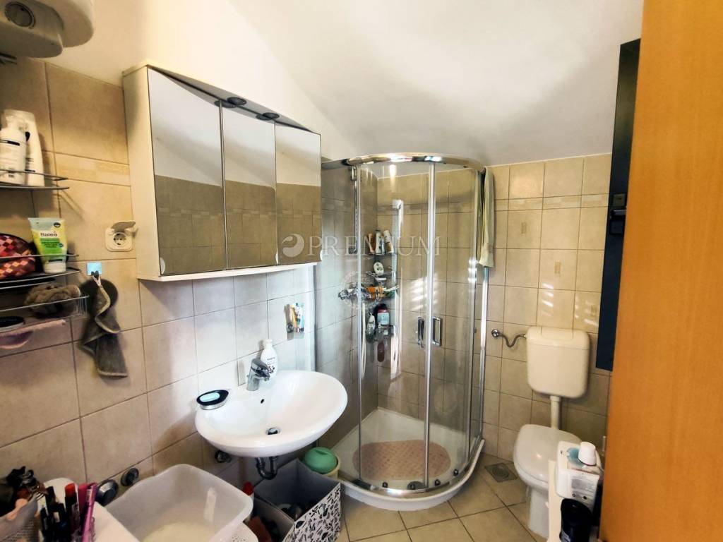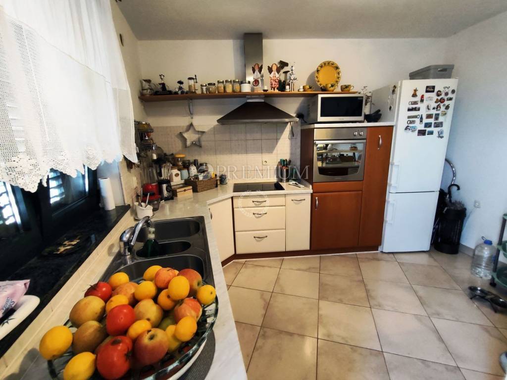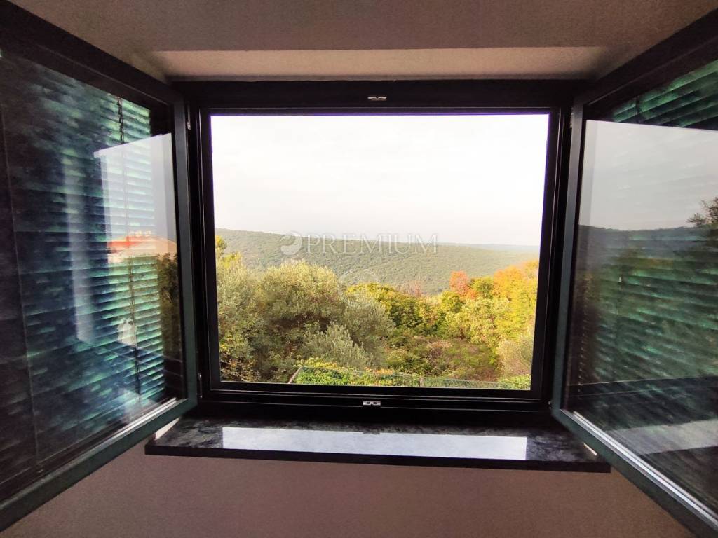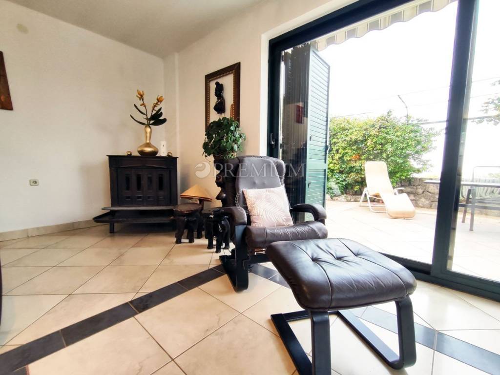 On the first floor, there is a hallway, two bedrooms, and one bathroom. At the end of the hallway is an exit to the terrace, offering a beautiful panoramic view of the sea and surrounding greenery. In the yard, covering 129m2, there is plenty of greenery and one parking spot.