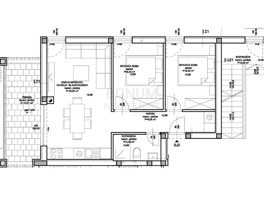 For sale is an apartment on the first floor with a total usable area of 65.04 m². The living area occupies 49.08 m², and the apartment has access to a terrace of 12.21 m². The apartment also comes with one parking space of 15 m². Thanks to its size and layout, the apartment provides comfort for living or attractiveness for renting.