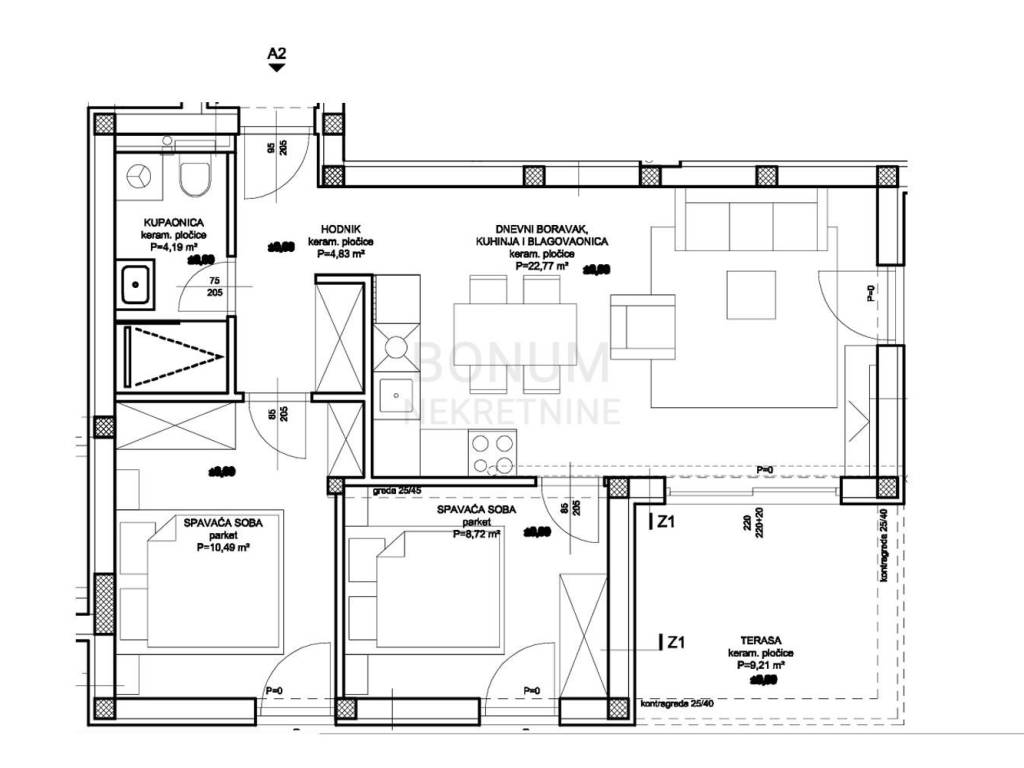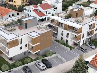 For sale is a two-bedroom apartment on the ground floor of a modern building in Vodice. The total usable area is 68.63 m², of which 51 m2 is residential. The apartment consists of a hallway, two bedrooms, a bathroom, a living room connected to the kitchen and dining room, and a terrace with access to the 30 m² yard. The apartment also has one parking space.