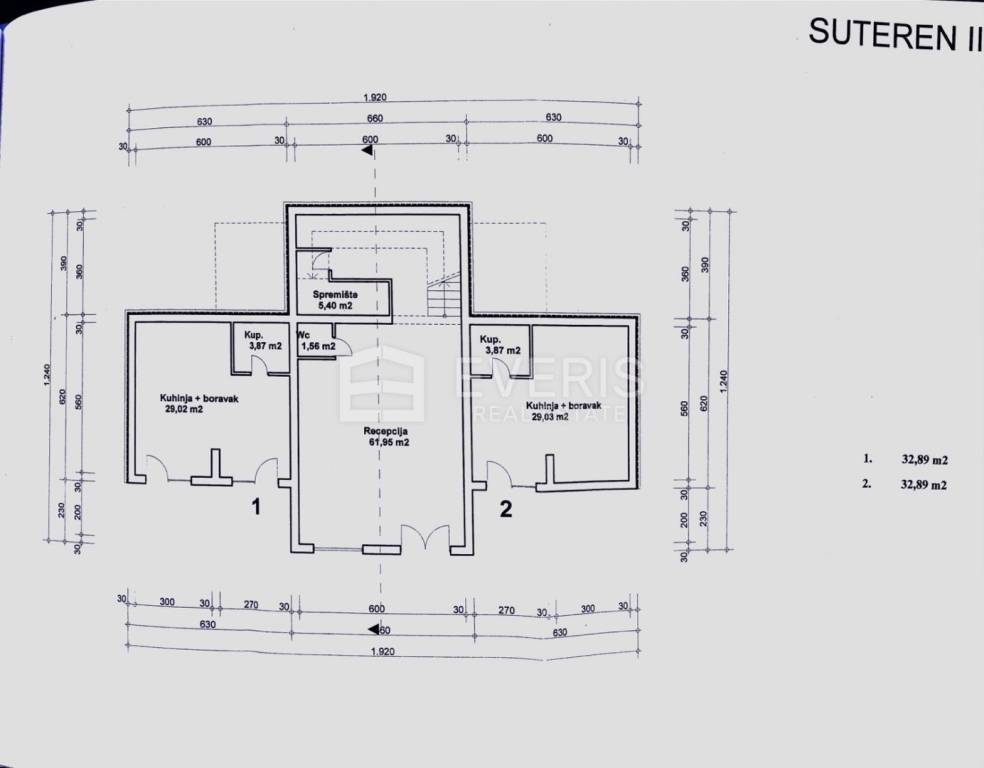 - apartment No. 1: 32.89 m2 (kitchen + living room, bathroom)