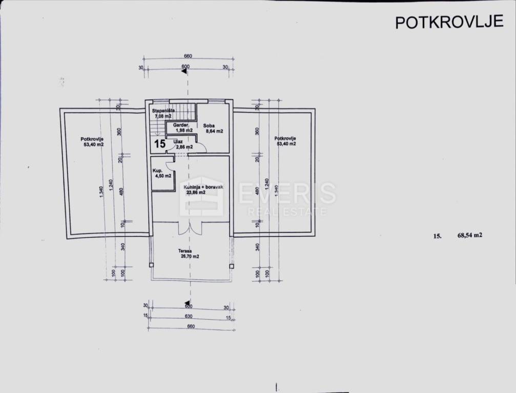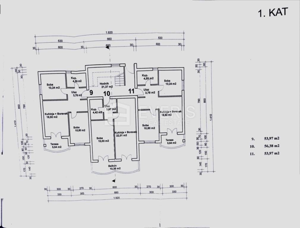 - apartmana br. 13: 53,97 m2 (ulaz, kupaonica, kuhinja + dnevni boravak, spavaća soba, terasa)