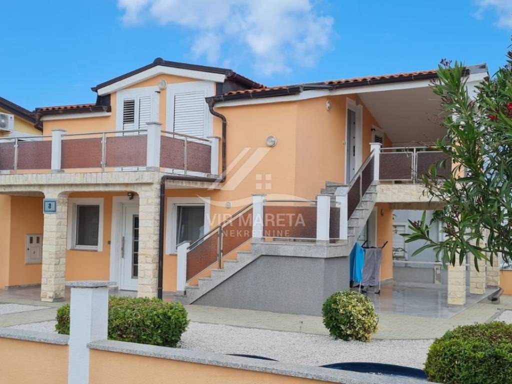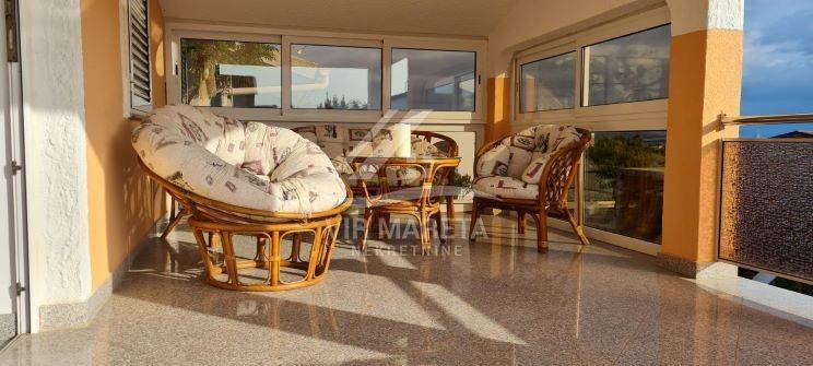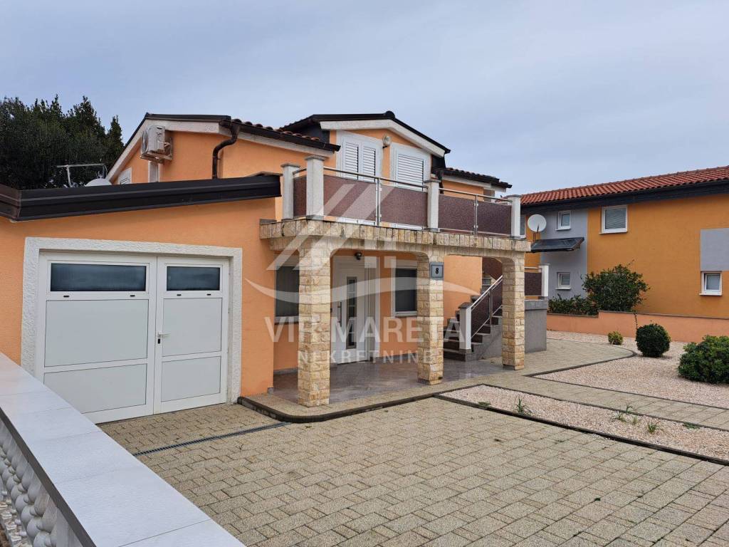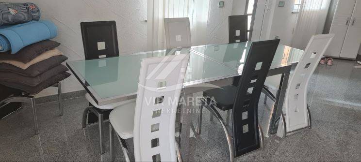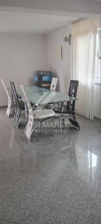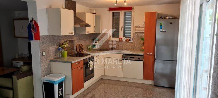 Family house with garage in a quiet street only 200 meters from the sea. It consists of ground and first floor. On the ground floor there is a den, a large dining room, a spacious living room, a bathroom with a toilet and a covered terrace. There is also a garage on the ground floor. Upstairs there are 4 bedrooms, bathroom with toilet, hallway and two terraces. The first floor is reached by external stairs. The house has a sewer and a septic tank for waste water. The construction project for the swimming pool has been prepared and it is possible to build it. The yard is fenced and fully landscaped. There are two arranged parking spaces in front of the garage. There is a barbecue in the yard. The house is sold fully furnished. Ownership in order. Possible agreement on the price.