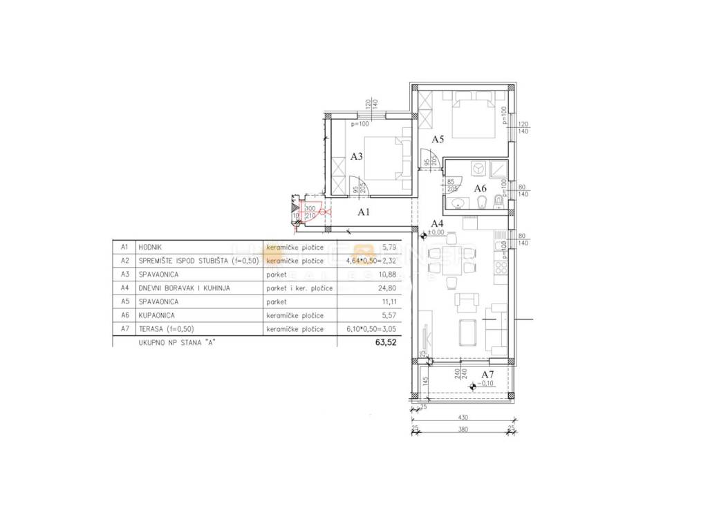 Apartment A on the ground floor = 63.52 m2 + outdoor parking space = 66.50 m2 = 266,600.00 eur