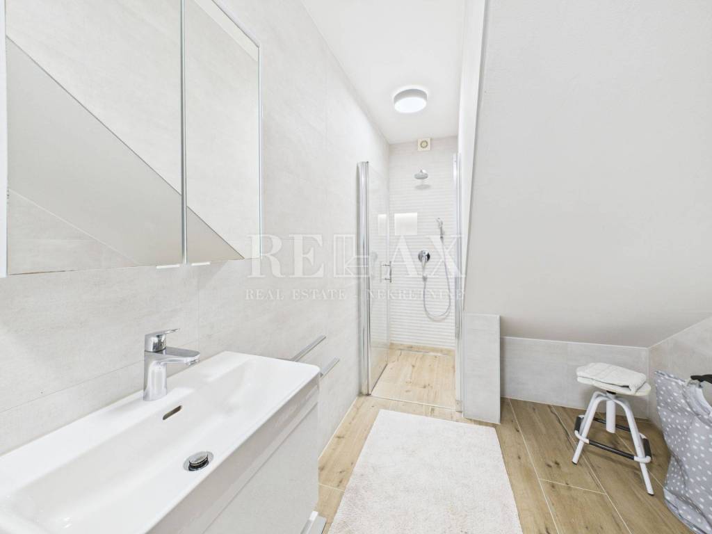 The apartment, with a total living area of 125 m², is spread over two floors. The lower level features three bedrooms, two bathrooms, and two practical storage rooms. The ground floor is designed as an open-concept space with a kitchen, dining area, and living room, which leads to a spacious covered terrace. The terrace extends to a beautiful 108 m² yard with a swimming pool, a sunbathing area, and a relaxation space—ideal for enjoying warm days.