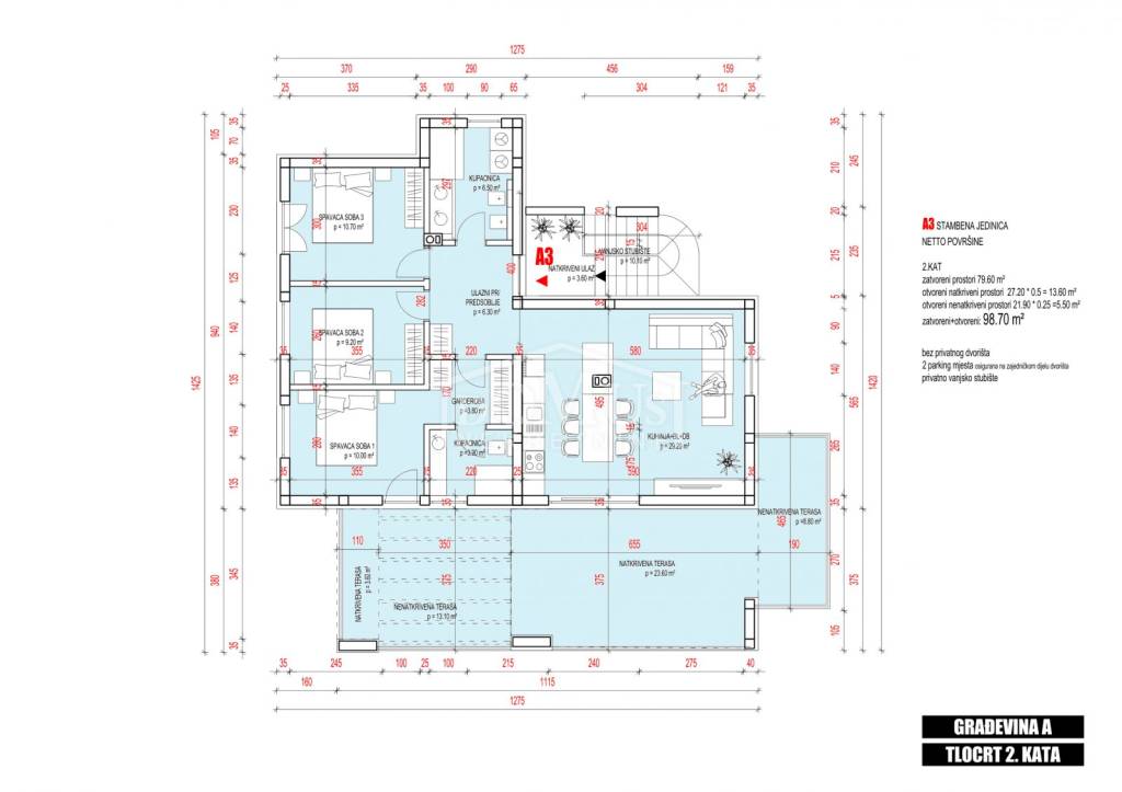 RESIDENTIAL UNIT A3- Aapartment on the 2nd floor with a total of 98.70 m2 of usable area with 2 parking spaces. The apartment occupies the entire back floor of the building, has a spacious living room with a kitchen and dining room, a storage room, two bathrooms, a hallway, 3 bedrooms, a wardrobe, a hallway, and a partially covered terrace with a total area of 49.10m2.