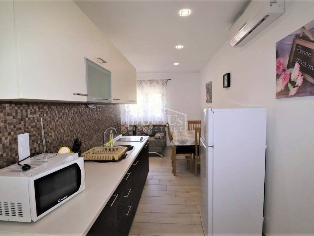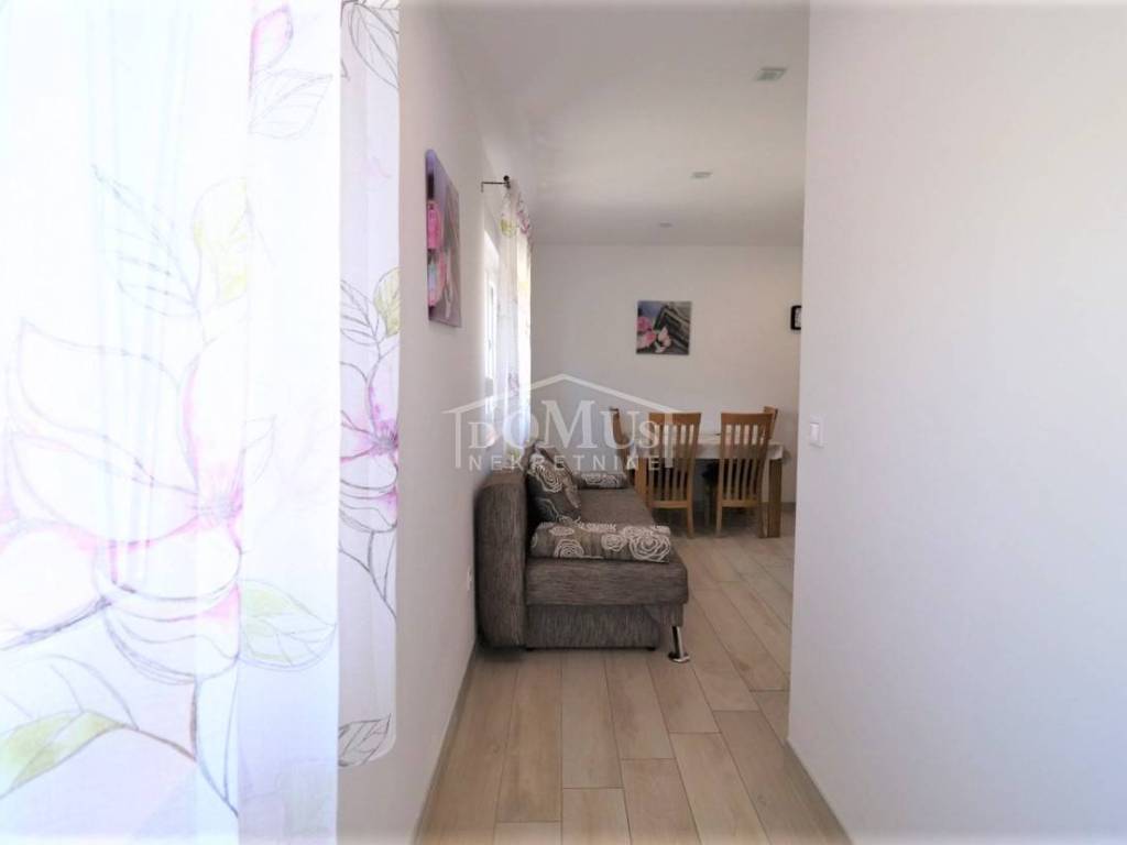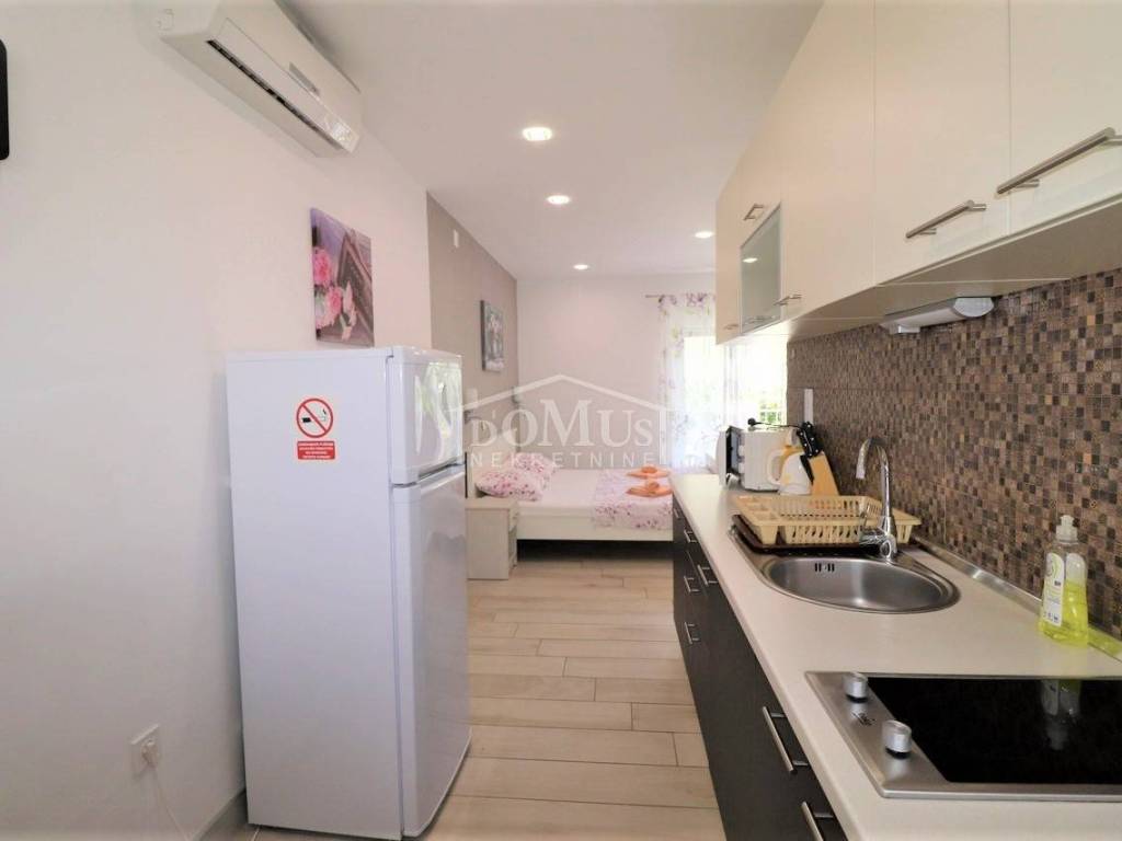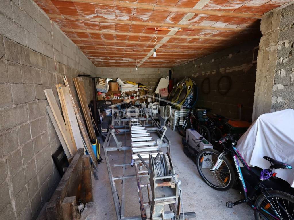 Attractive location, distance 230m from Lovetovo beach. Studio apartment on the ground floor, south side, with a total usable area of 36.50 m2, which consists of a kitchen with a dining room and a living room, as well as a bedroom as a whole, a bathroom, a terrace of 4.96 m2 and a garden of 15.66 m2. The apartment is fully furnished, it is included in the price of the property. The apartment has a garage of 31.03 m2, which is not furnished, but with electricity and water installations, and one parking space in front of the garage. The apartment is 1500m from the city center.