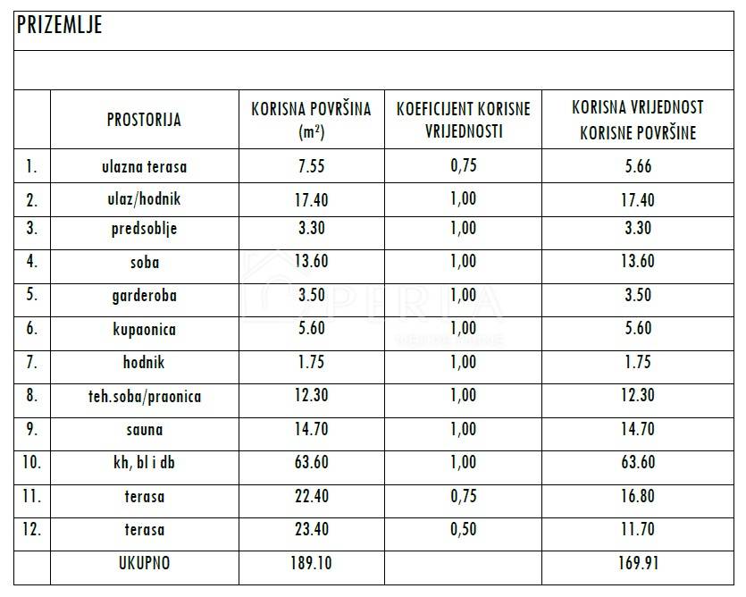 On the ground floor, from the entrance terrace, you enter a long corridor that further leads to the rooms: bedroom with wardrobe, bathroom, technical room/laundry room, sauna with access to its own terrace, pantry and large living room with kitchen and dining room.