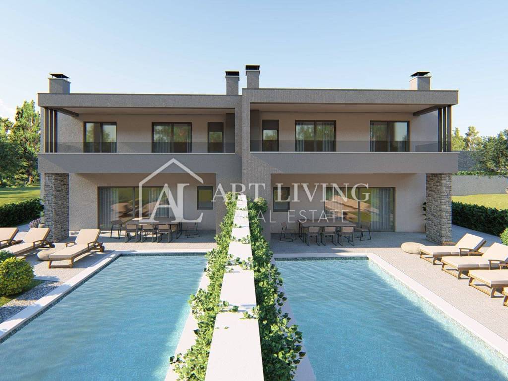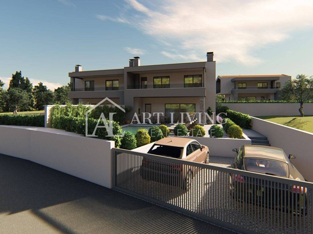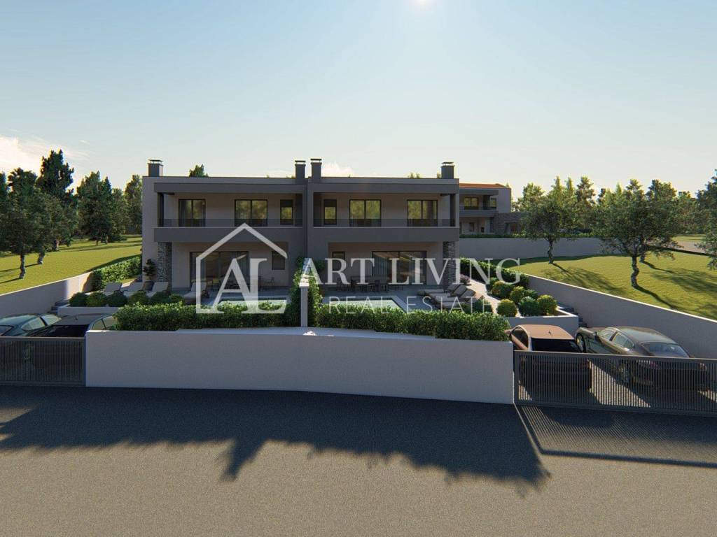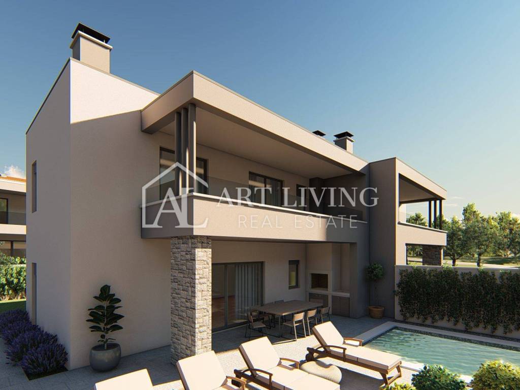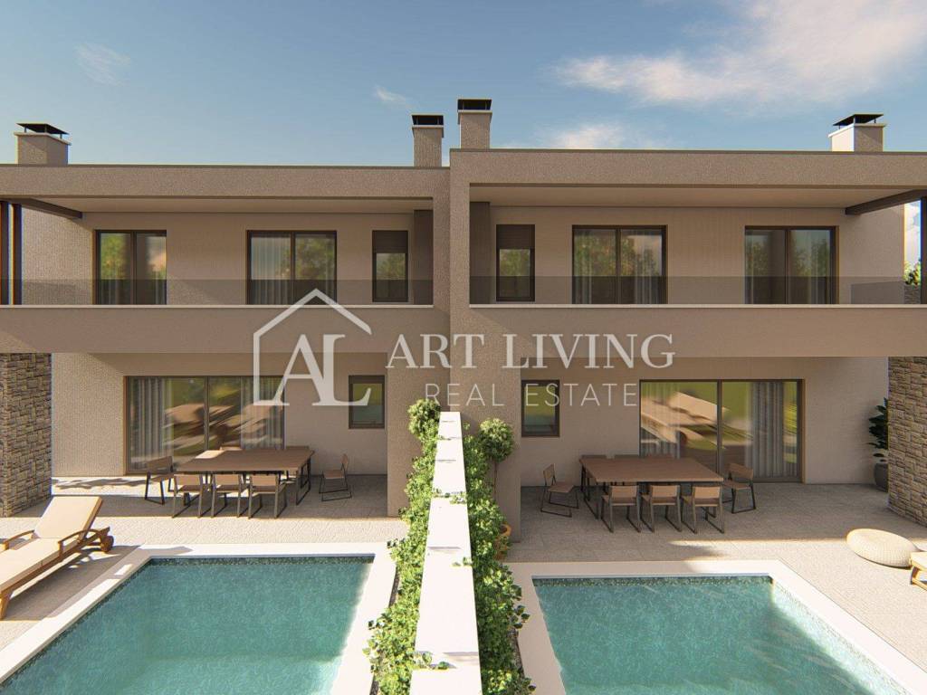 In a quiet village only 7 km from Poreč and only 600 meters from the sea and well-kept beaches, a high-quality semi-detached house with a swimming pool is for sale, with a net usable area of ​​127 m2 with a garden area of ​​260 m2, a unique floor plan, modern design and high-quality construction.
