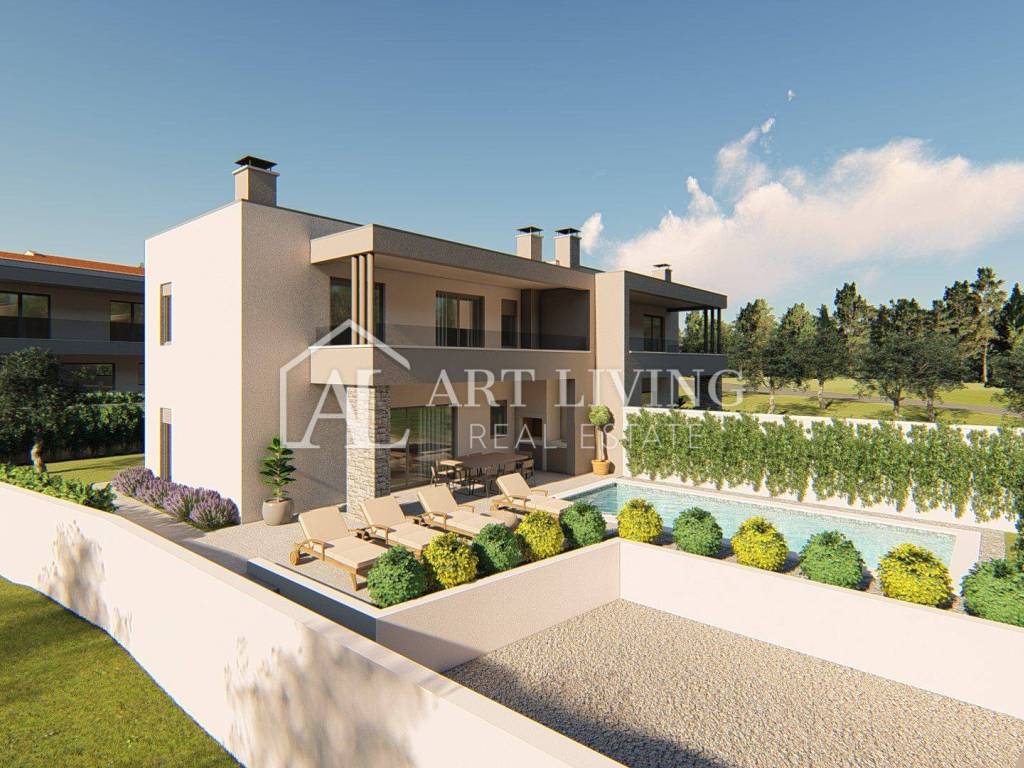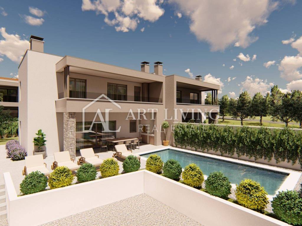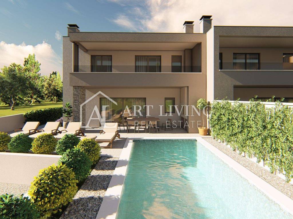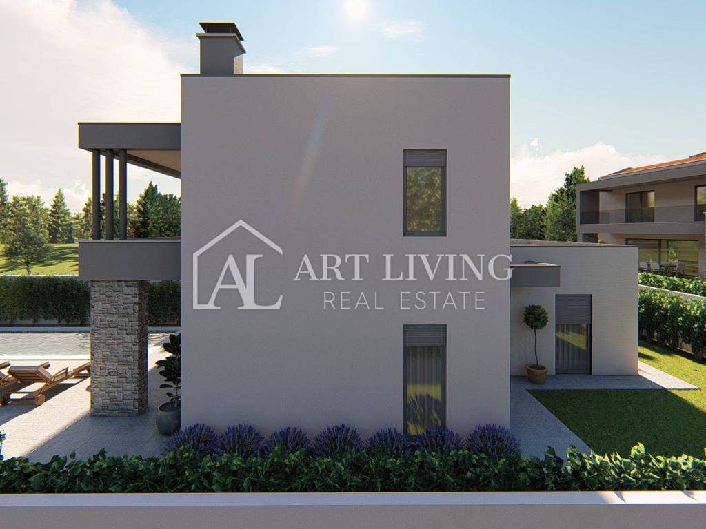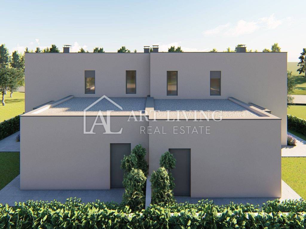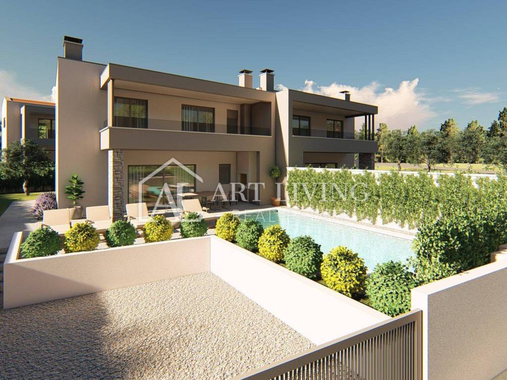 In a quiet village only 7 km from Poreč and only 600 meters from the sea and well-kept beaches, a high-quality semi-detached house with a swimming pool is for sale, with a net usable area of ​​127 m2 with a garden area of ​​260 m2, a unique floor plan, modern design and high-quality construction.