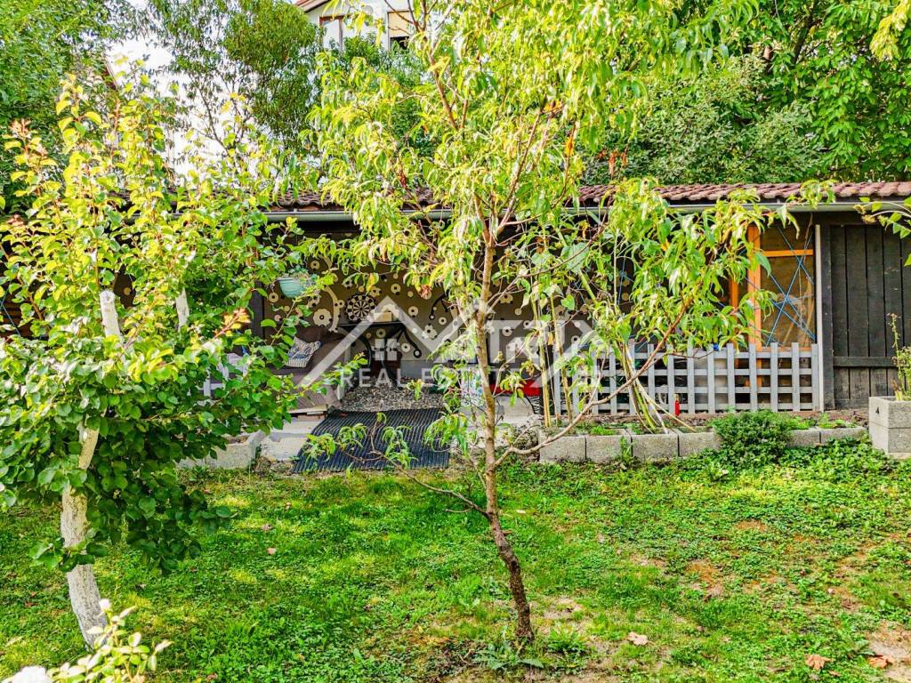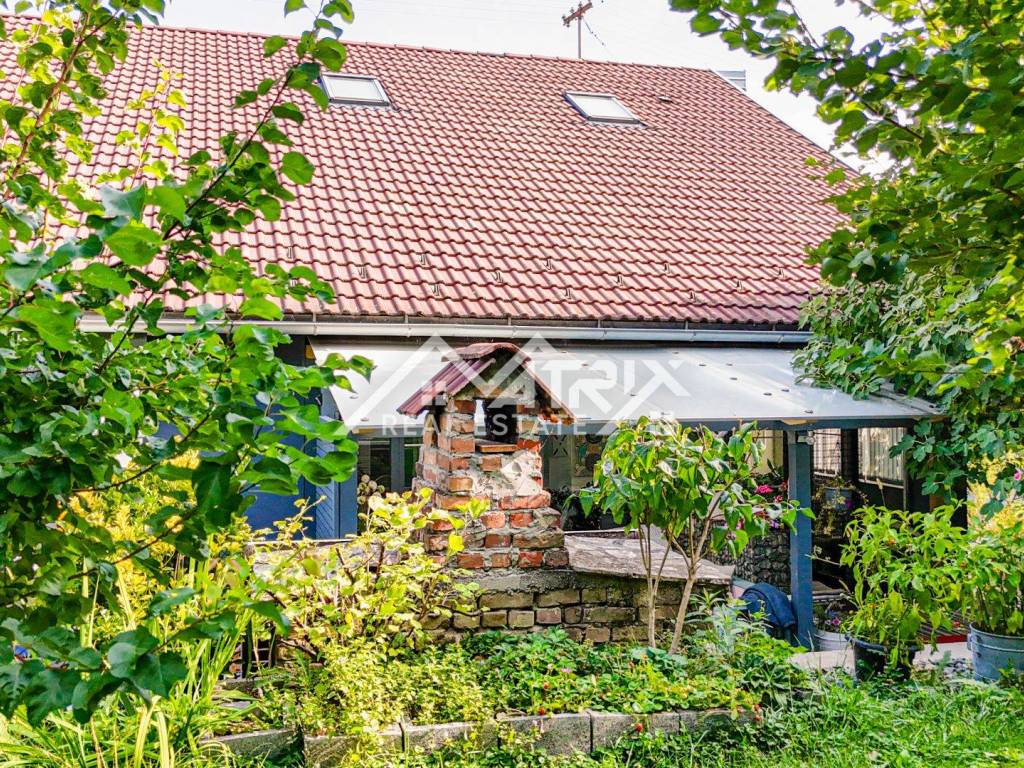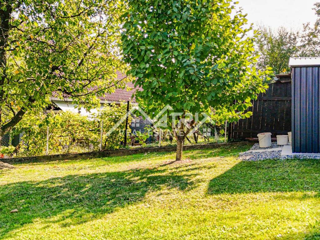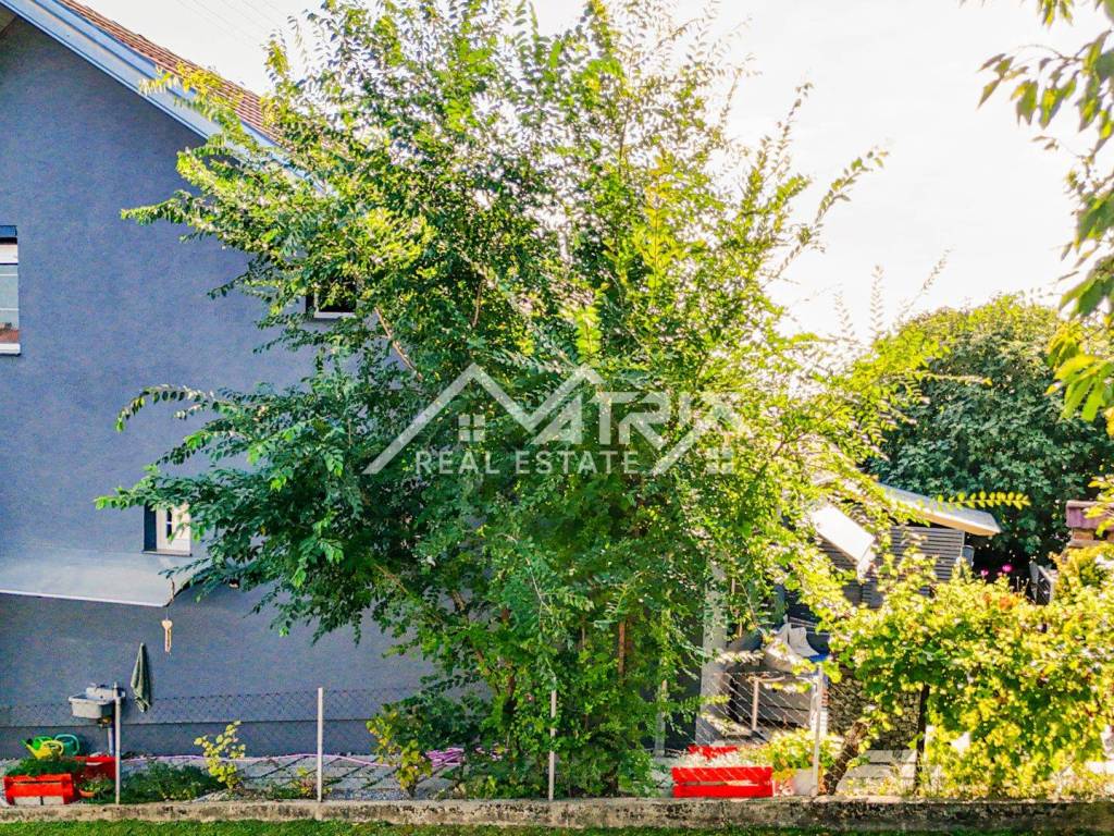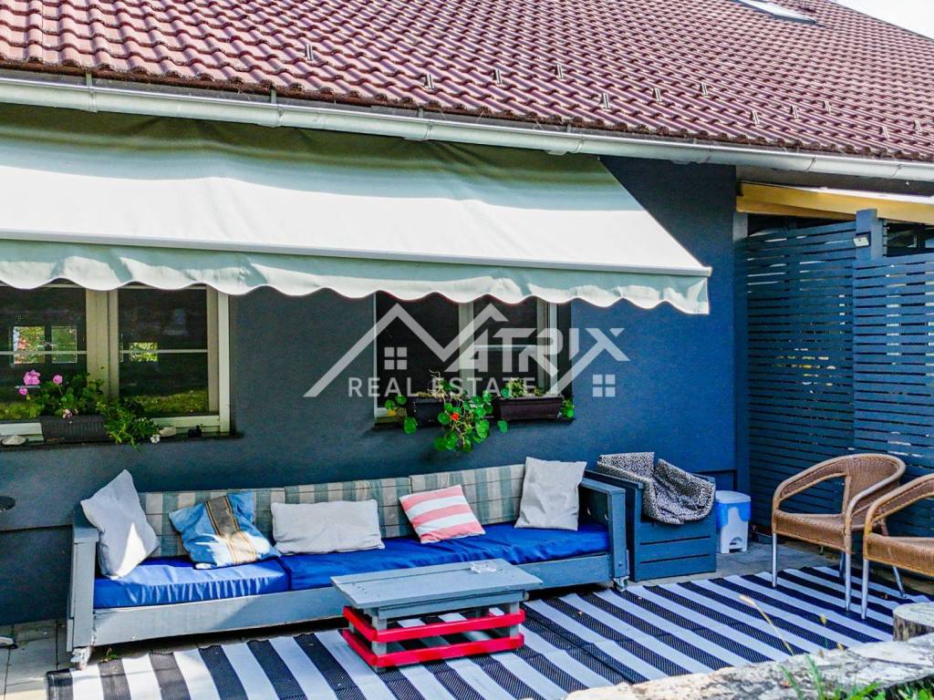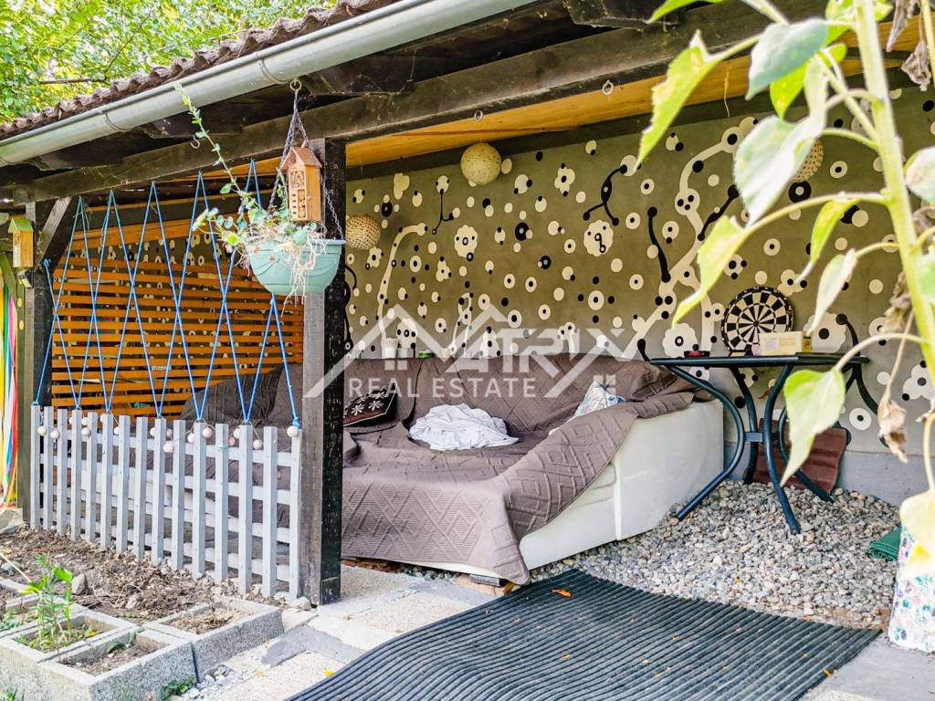 The 600 m² yard is designed for relaxation and gatherings, featuring a covered outdoor area, a brick-built barbecue, and a tool shed, surrounded by lush greenery and flowers. This home offers everything needed for comfortable family living and, thanks to its size and layout, is also suitable for combining residential and business purposes.