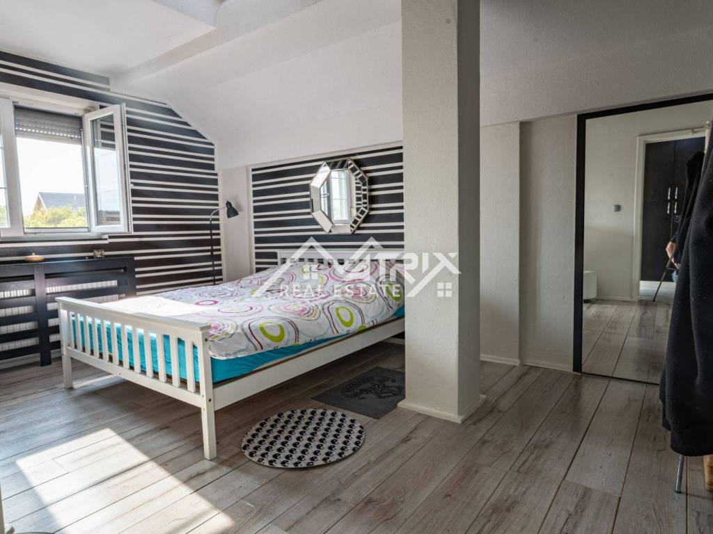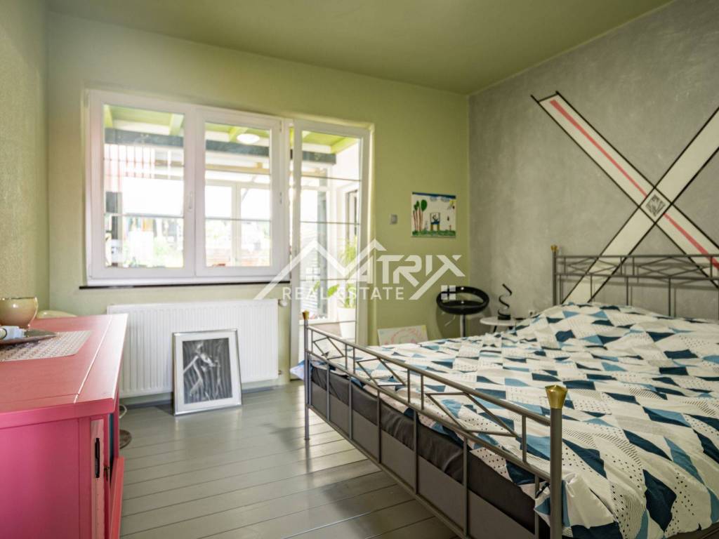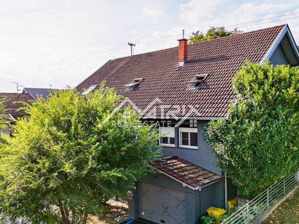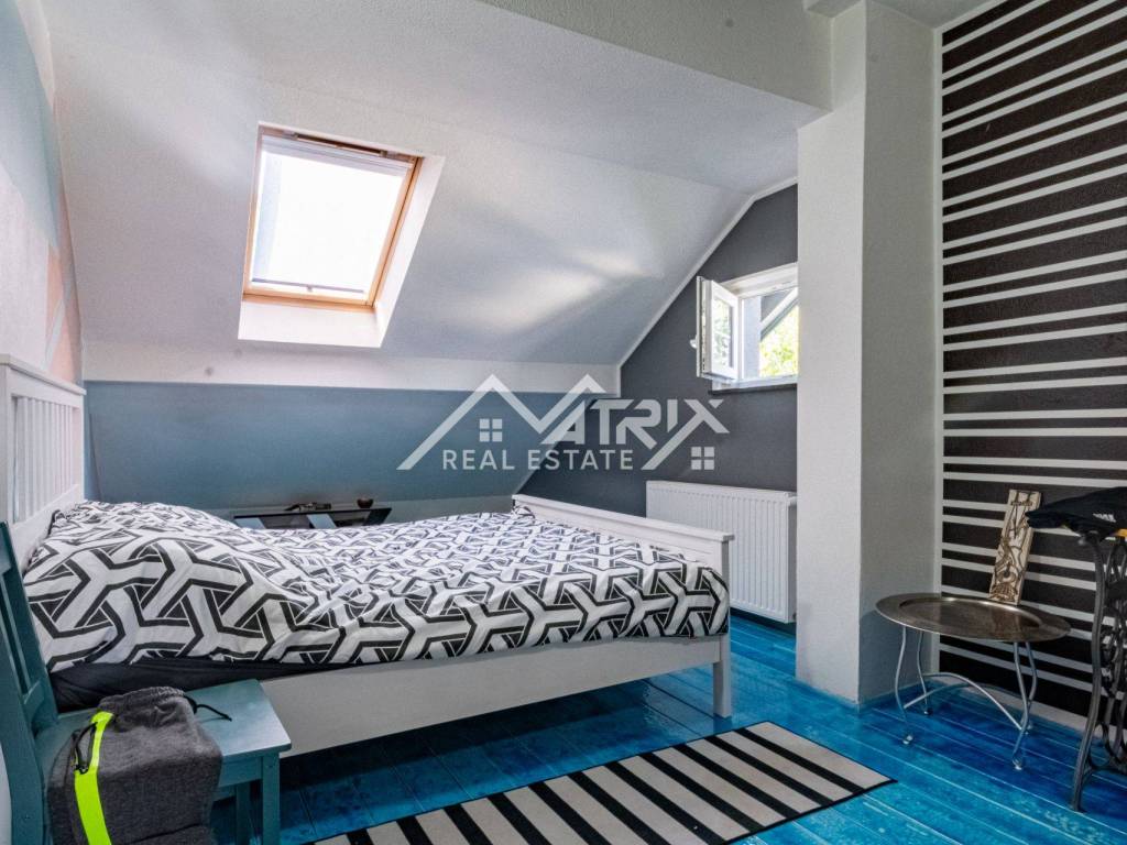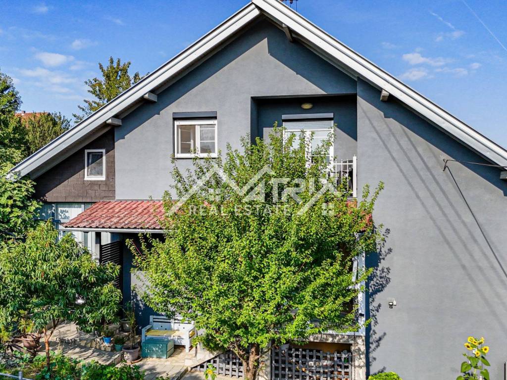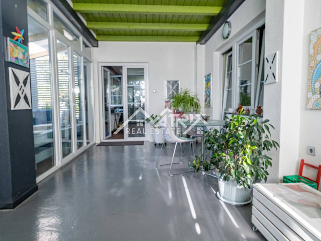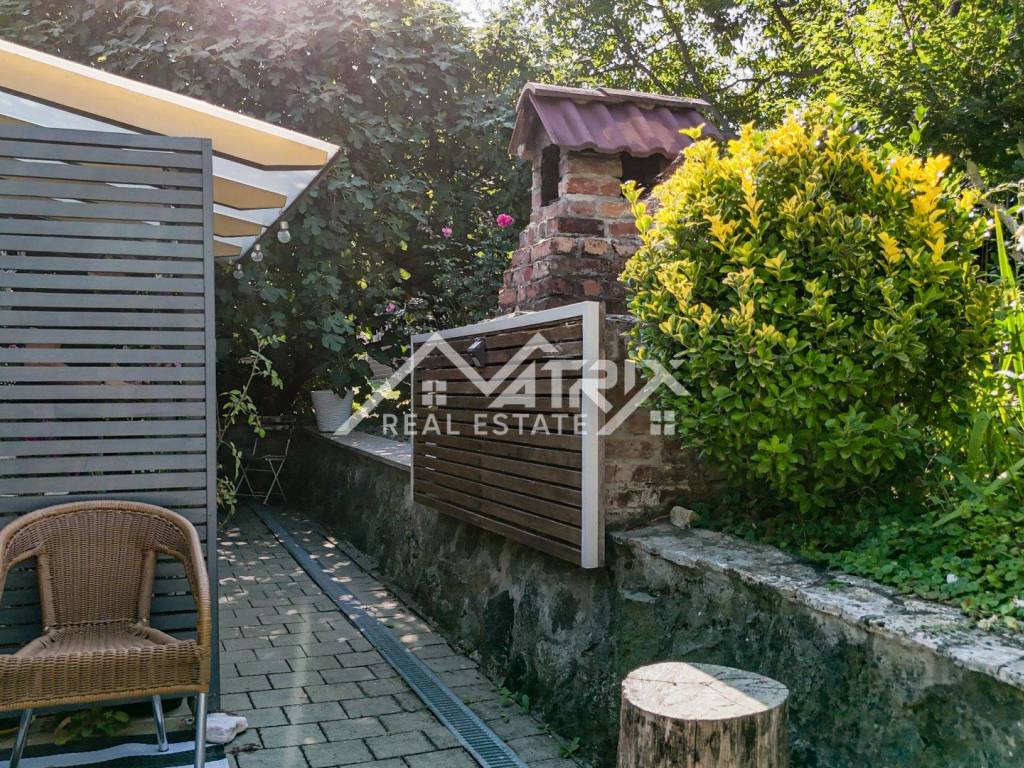 The 600 m² yard is designed for relaxation and gatherings, featuring a covered outdoor area, a brick-built barbecue, and a tool shed, surrounded by lush greenery and flowers. This home offers everything needed for comfortable family living and, thanks to its size and layout, is also suitable for combining residential and business purposes.