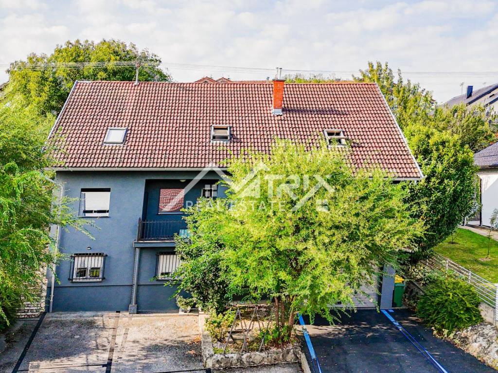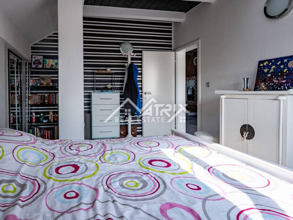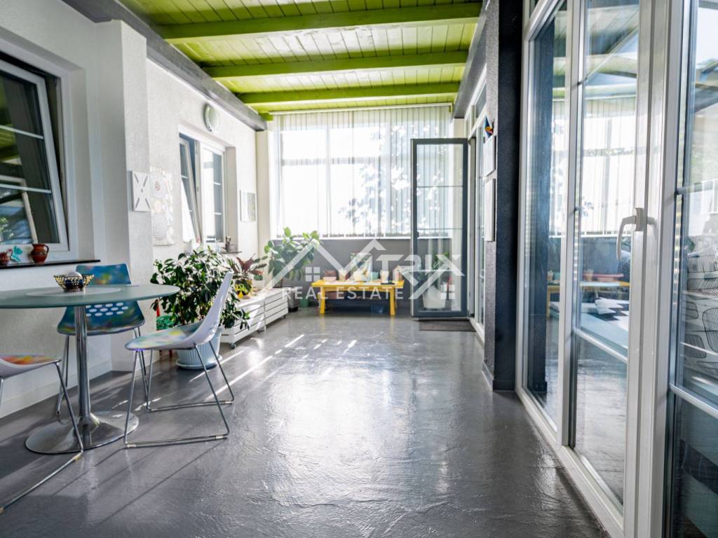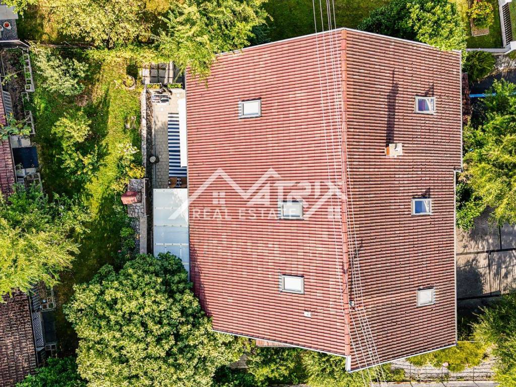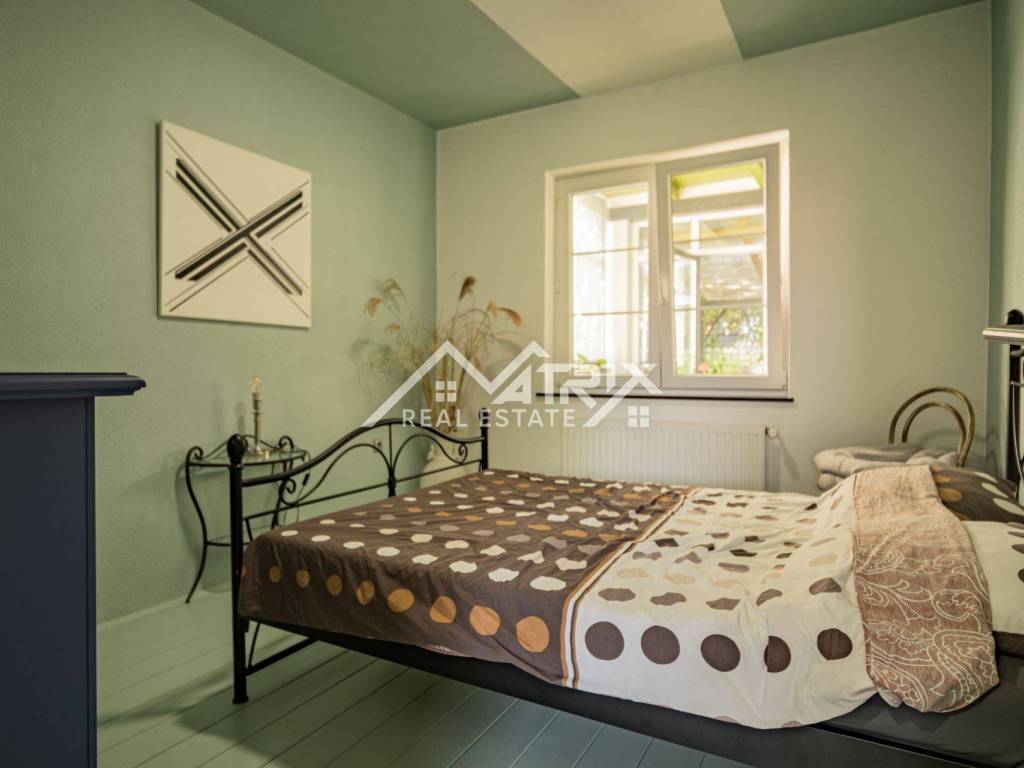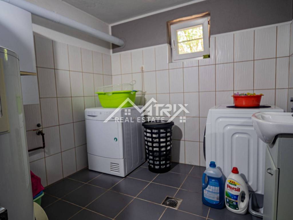 The 600 m² yard is designed for relaxation and gatherings, featuring a covered outdoor area, a brick-built barbecue, and a tool shed, surrounded by lush greenery and flowers. This home offers everything needed for comfortable family living and, thanks to its size and layout, is also suitable for combining residential and business purposes.