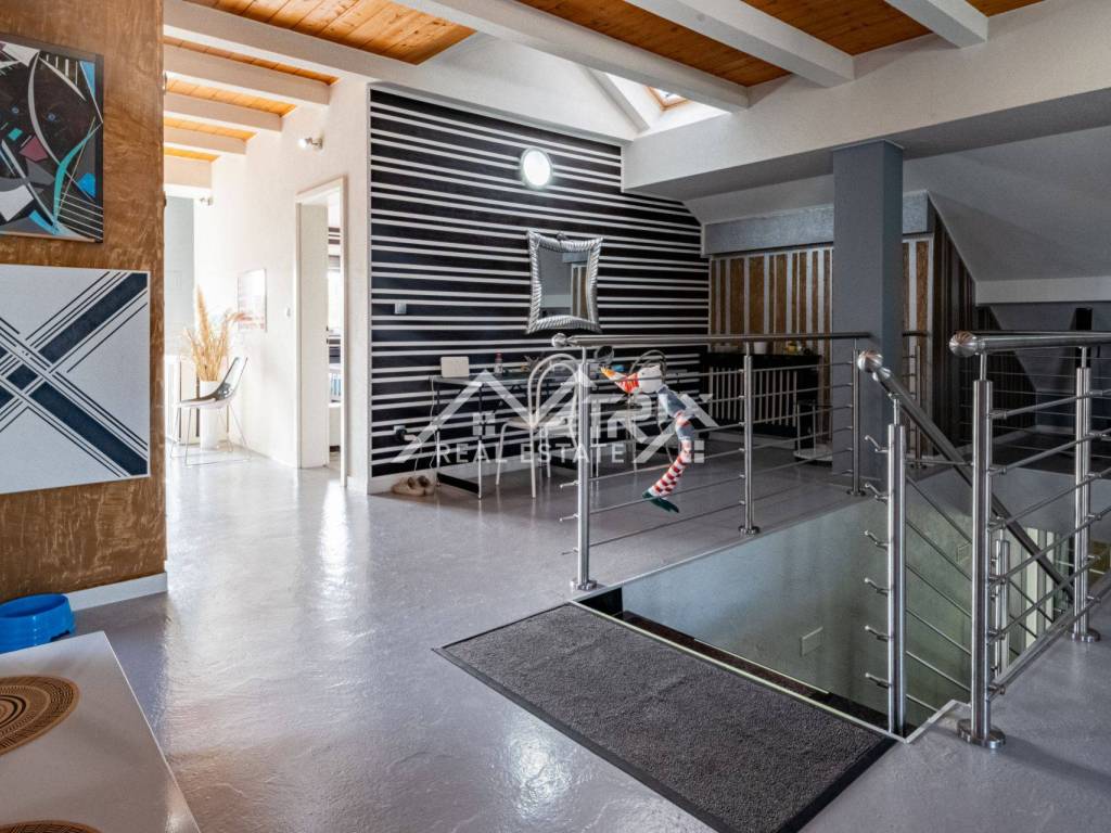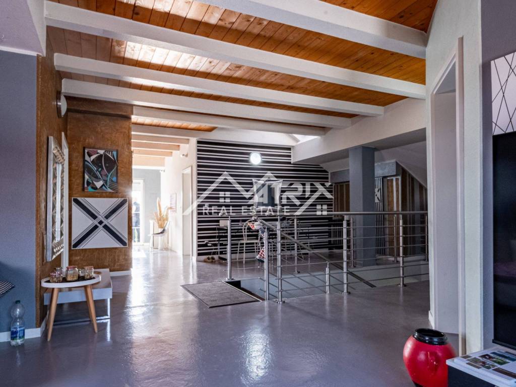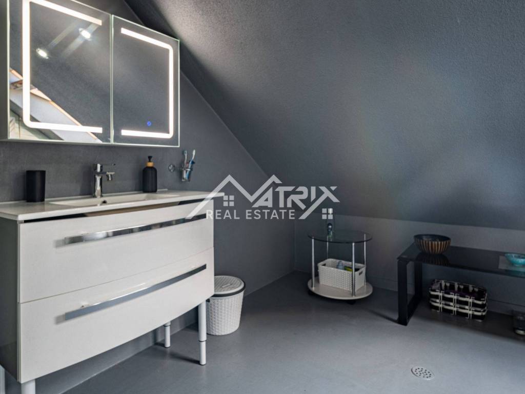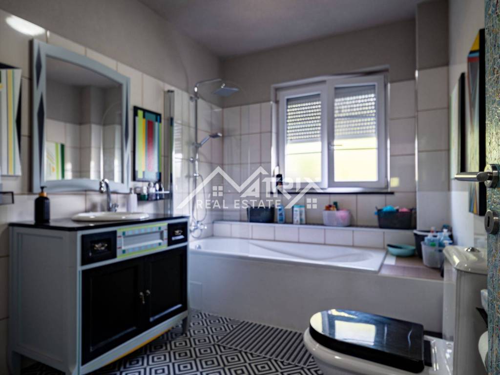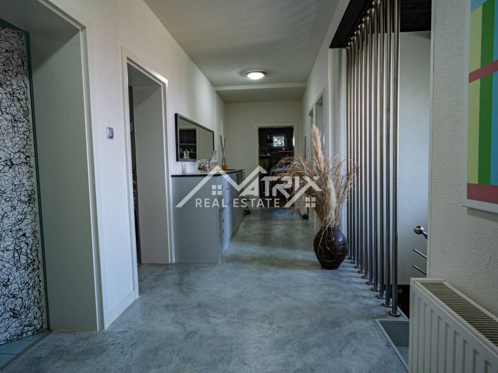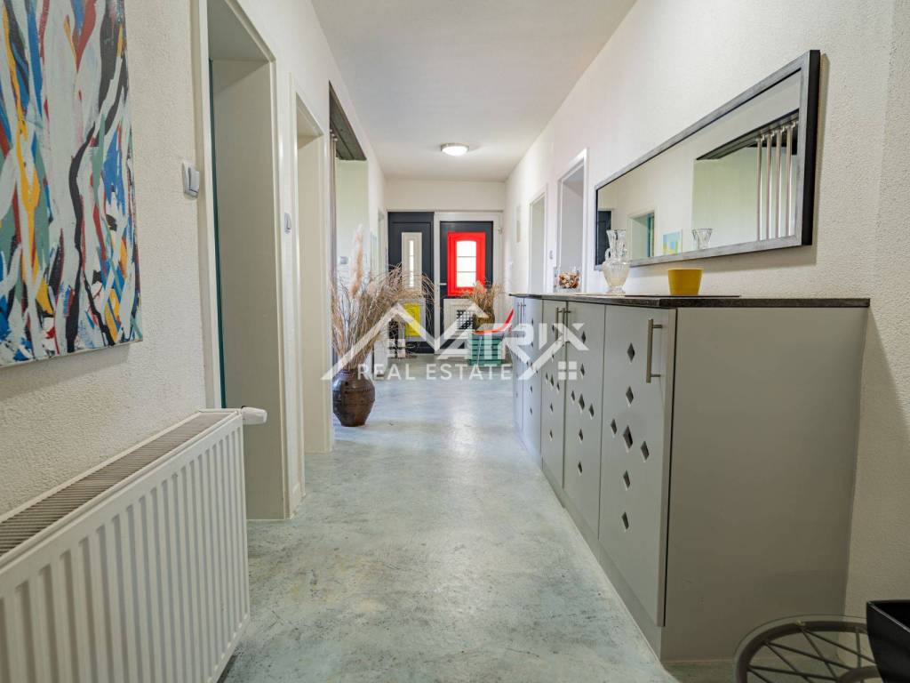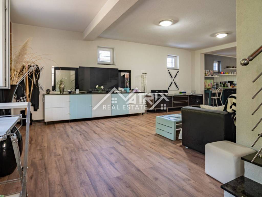 In Slatina, a spacious family house of 395 m² is for sale, built in 1986 and completely renovated with high-quality materials in 2007. The property consists of a ground floor and an upper floor, with a full basement beneath the entire house including a garage and additional utility rooms. The interior is modernly designed, full of natural light and warm colors, creating a bright and welcoming atmosphere.