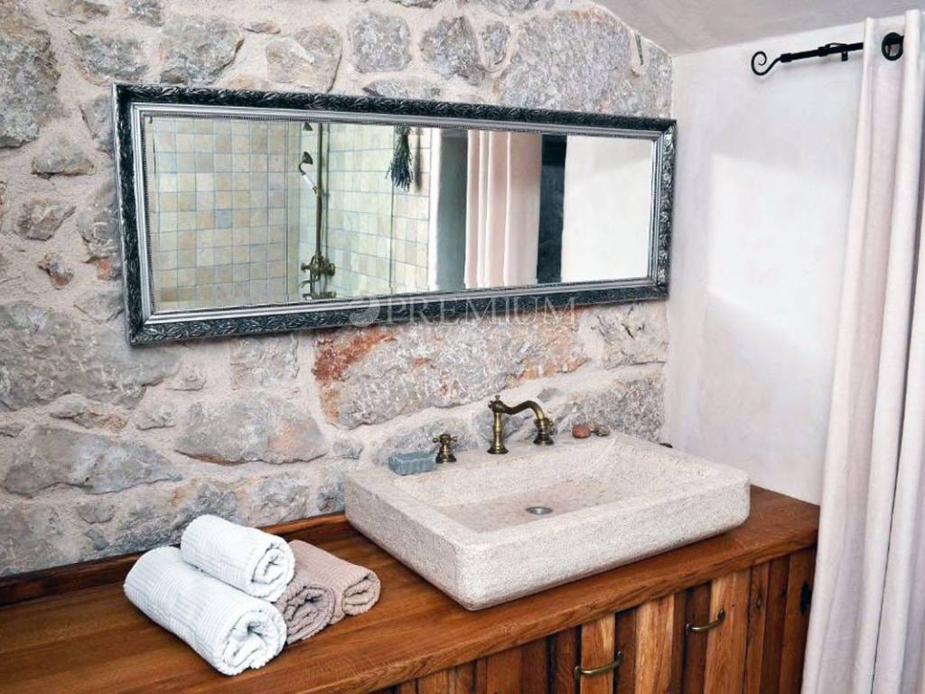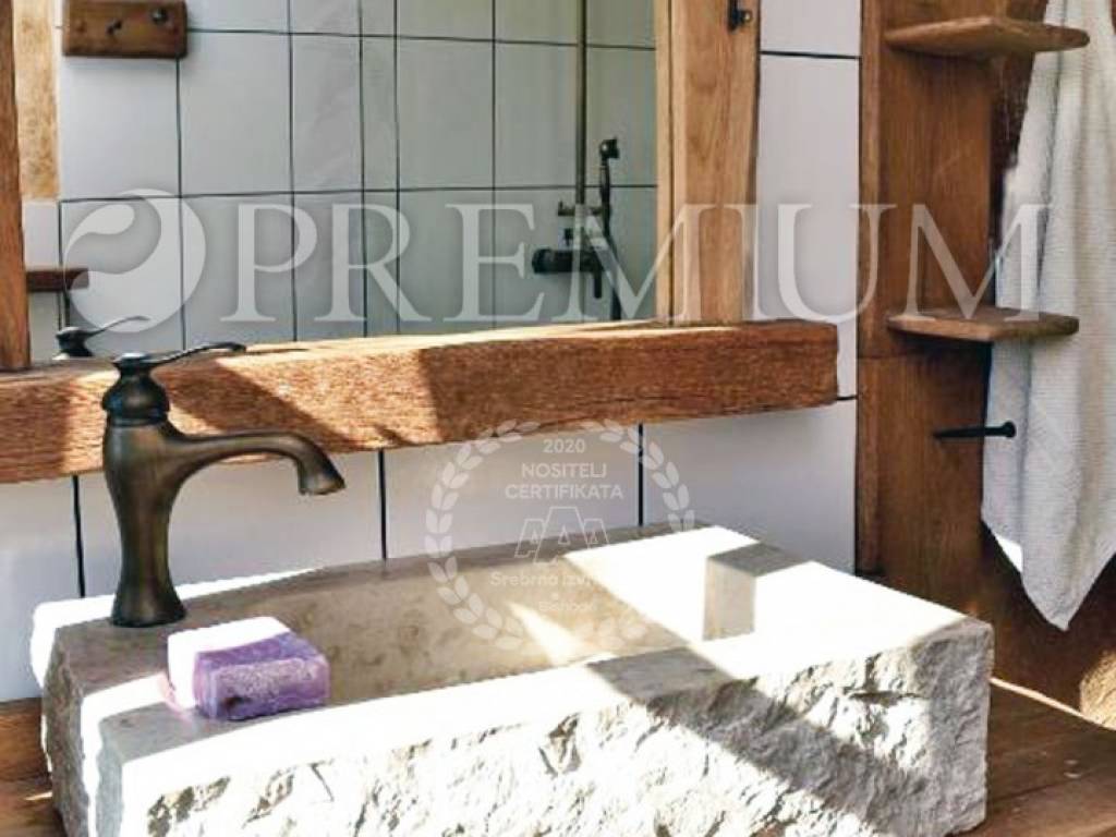 During the renovation, high-quality materials and equipment were used to provide a sense of luxury while retaining a warm homey feel. Custom-made wooden windows and doors were installed, stone and farmhouse floor coverings, underfloor heating with a heat pump, and air conditioning. Special ambiance is provided by details such as stone washbasins, wrought iron railing of the internal staircase, an indoor open fireplace in the style of a traditional hearth, bathroom fixtures that fit the concept, and selected furniture.