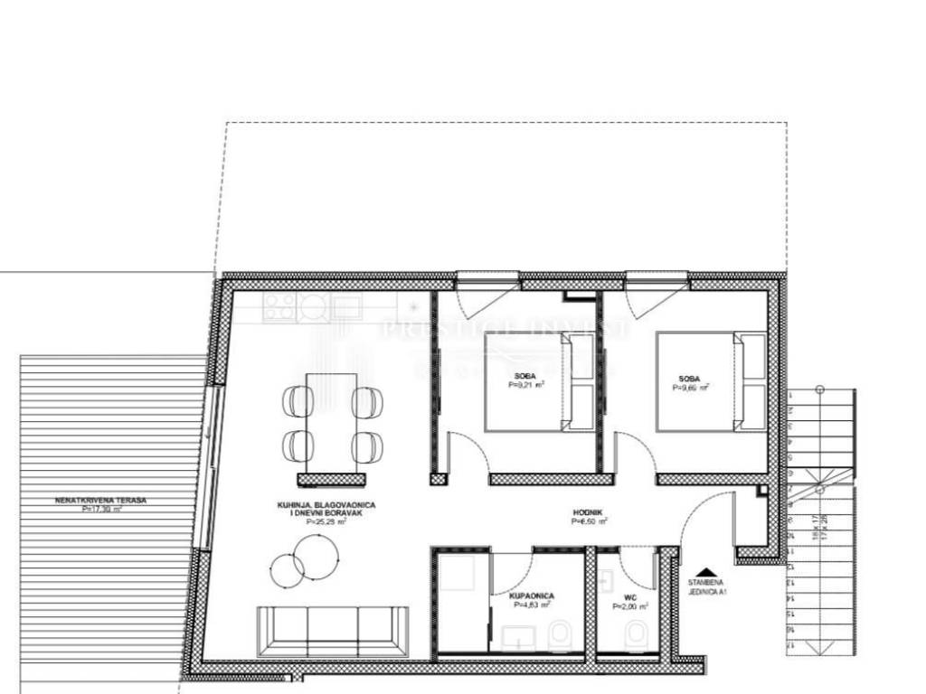 The apartment on the ground floor consists of a kitchen, dining room and living room, hallway, 2 bedrooms, bathroom and toilet. The square footage of the apartment without terrace and garden is 57.47 m2, with a total net usable area of ​​74m2. The apartment has an uncovered terrace and 1 parking space.
