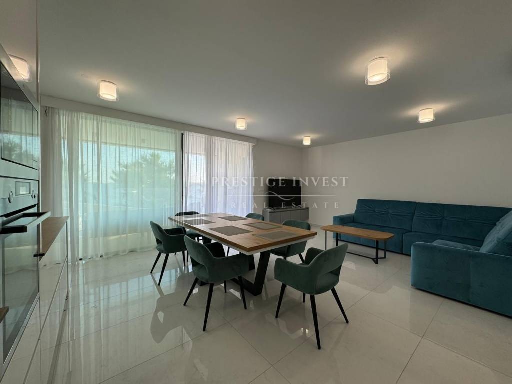For sale is a luxurious three-room apartment located on the ground floor of a modern building equipped with an elevator, swimming pools and an underground garage, first row by the sea.