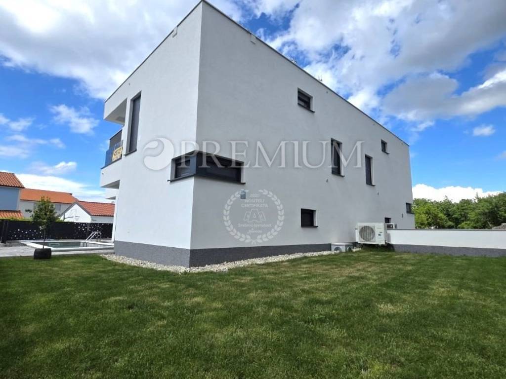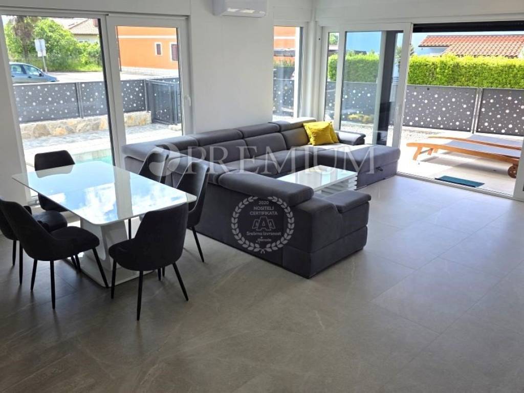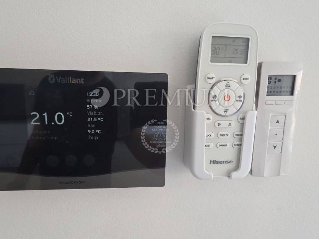 The property includes high-quality PVC joinery, security entrance door, ceramic flooring, top-tier underfloor heating with a heat pump system, and additional air conditioning in all rooms. The entire house is equipped with electric shutters controlled by remote.