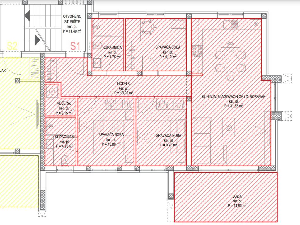 Apartment layout: Kitchen, dining room and living room - 31.65 m² Hallway - 10.05 m² Laundry room - 2.15 m² Bedroom 1 - 9.10 m² Bathroom 1 - 4.75 m² Bedroom 2 - 9.70 m² Bedroom room 3 - 10.80 m² Bathroom 2 - 4.20 m² Total usable area of the separate part: 82.40 m²